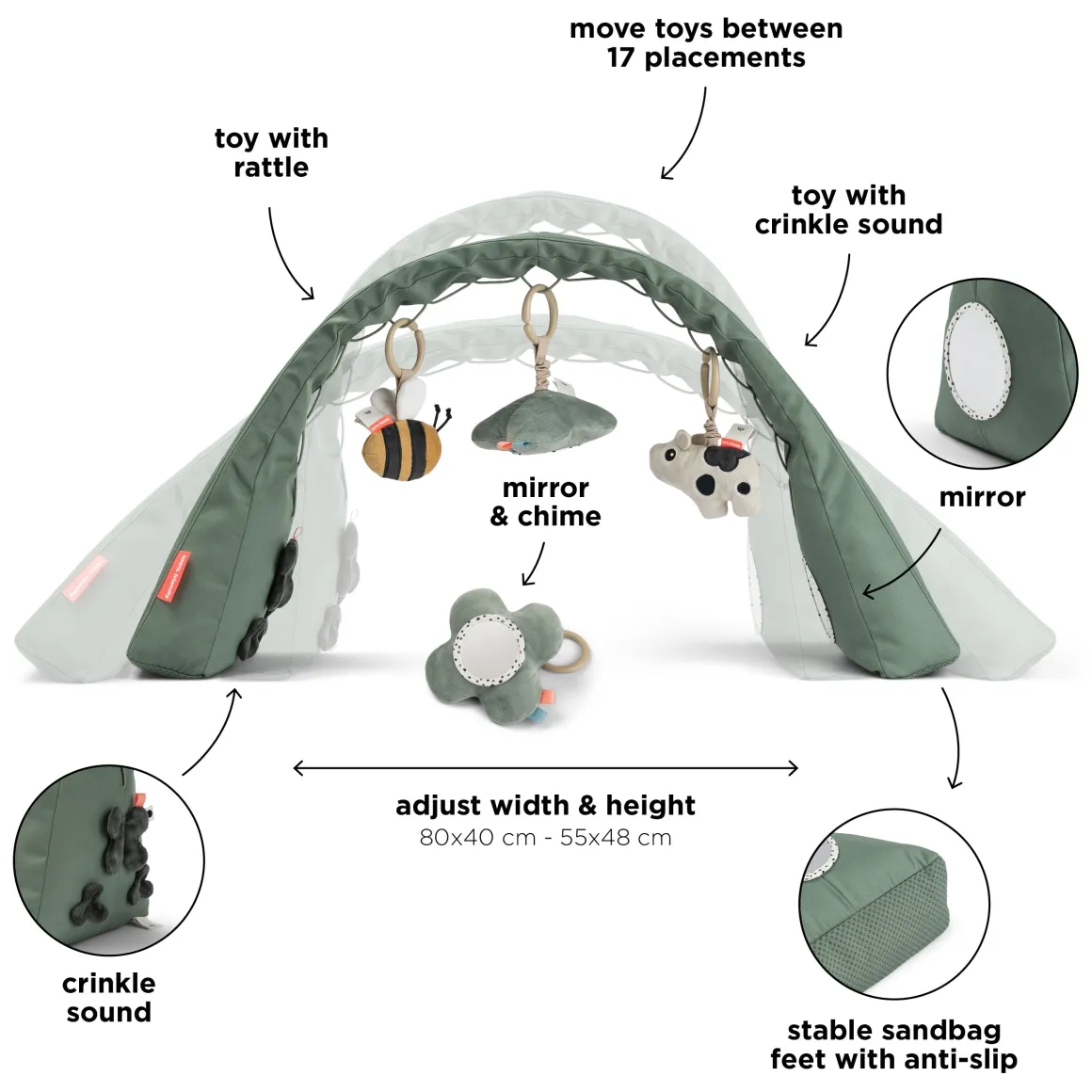 Arch: Fabric: 100% polyester. Filling: EVA foam, quartz sandbags, polyester fibres. Toys: Fabric: 100% polyester. Filling: 100% polyester fibres.