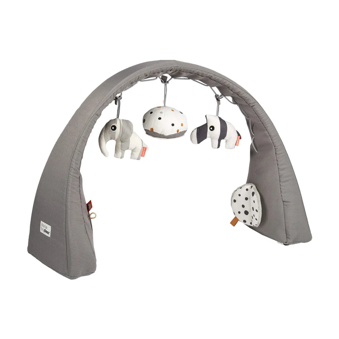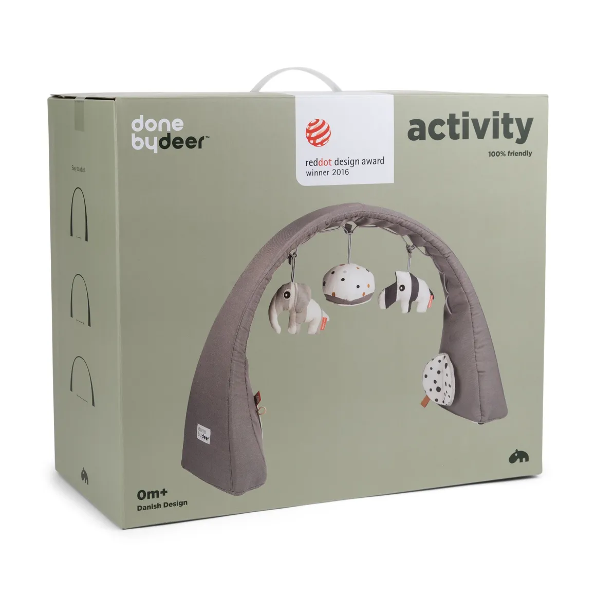 Comprend 5 activités : hochets, miroirs, sons bruissants, formes et textures. Les 3 jouets peuvent être déplacés entre 17 points de l’arche. Lauréat du red dot award du design 2016.