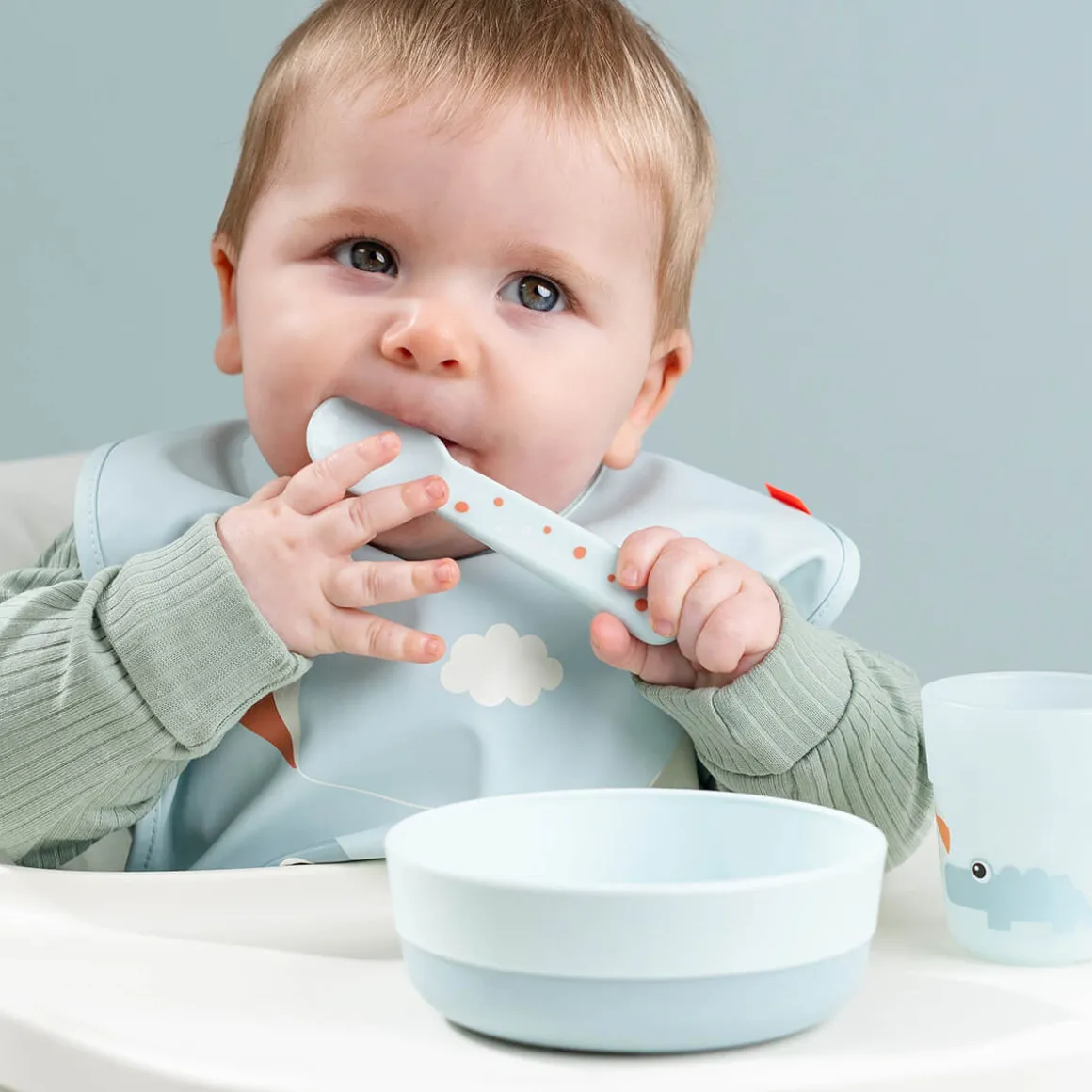 – Un bavoir pratique dans une belle couleur bleue.