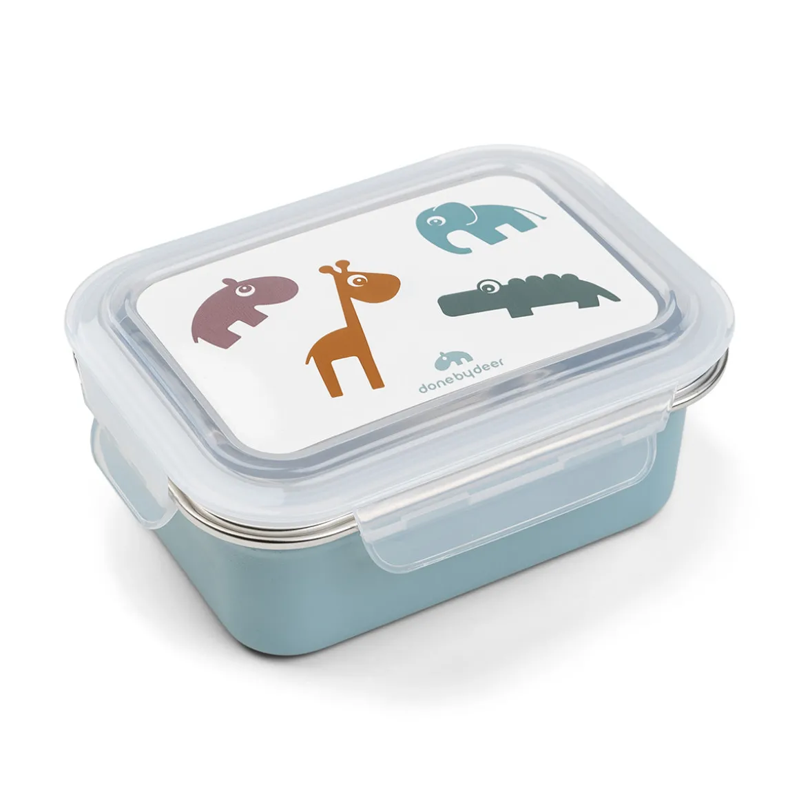 Cette lunch box pratique en métal est de couleur bleue. Le couvercle est décoré des amis Deer Croco, Elphee, Raffi og Ozzo dans des tons doux de vert, bleu, moutarde et poudre.