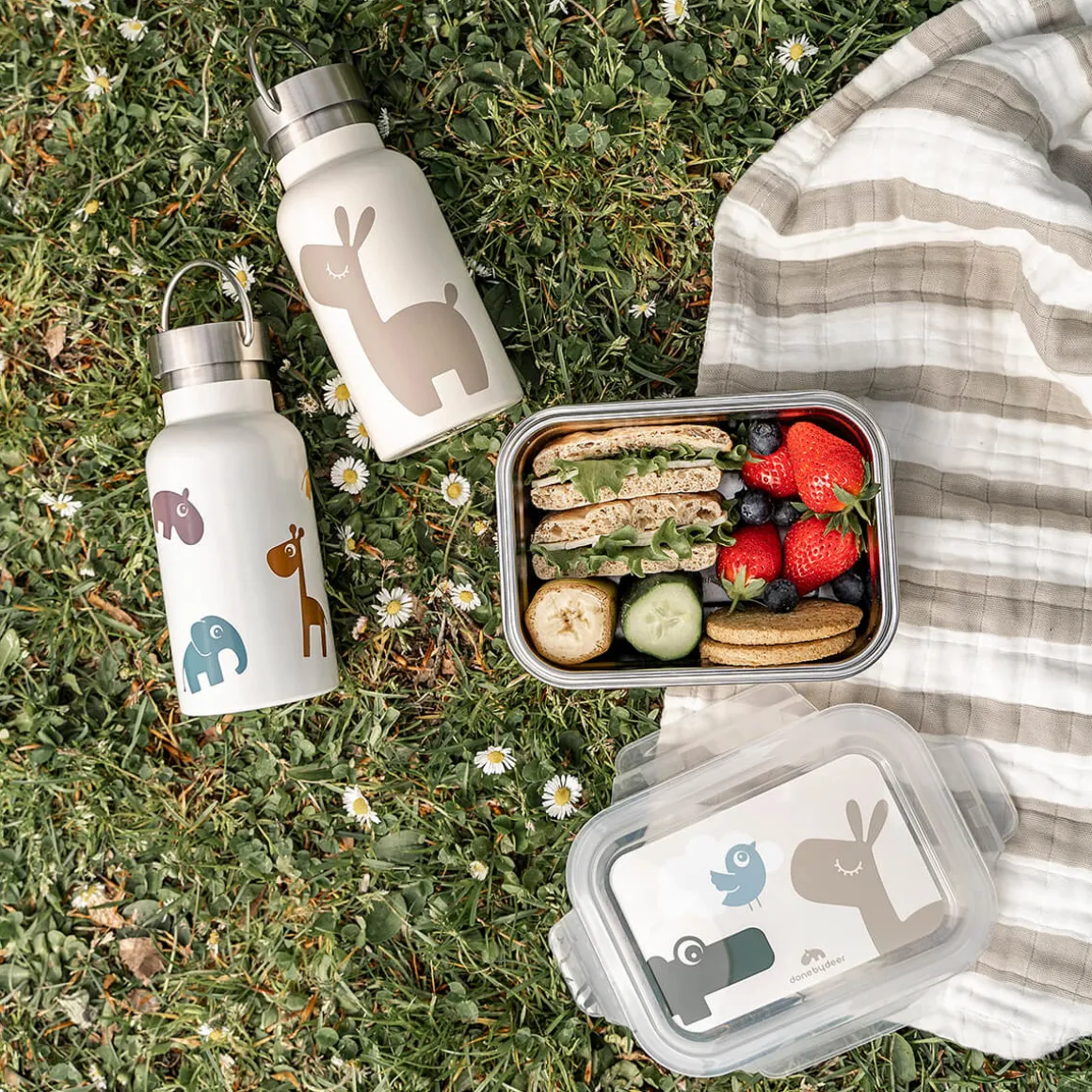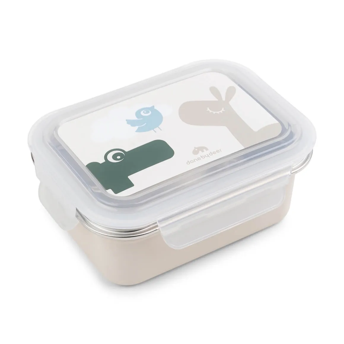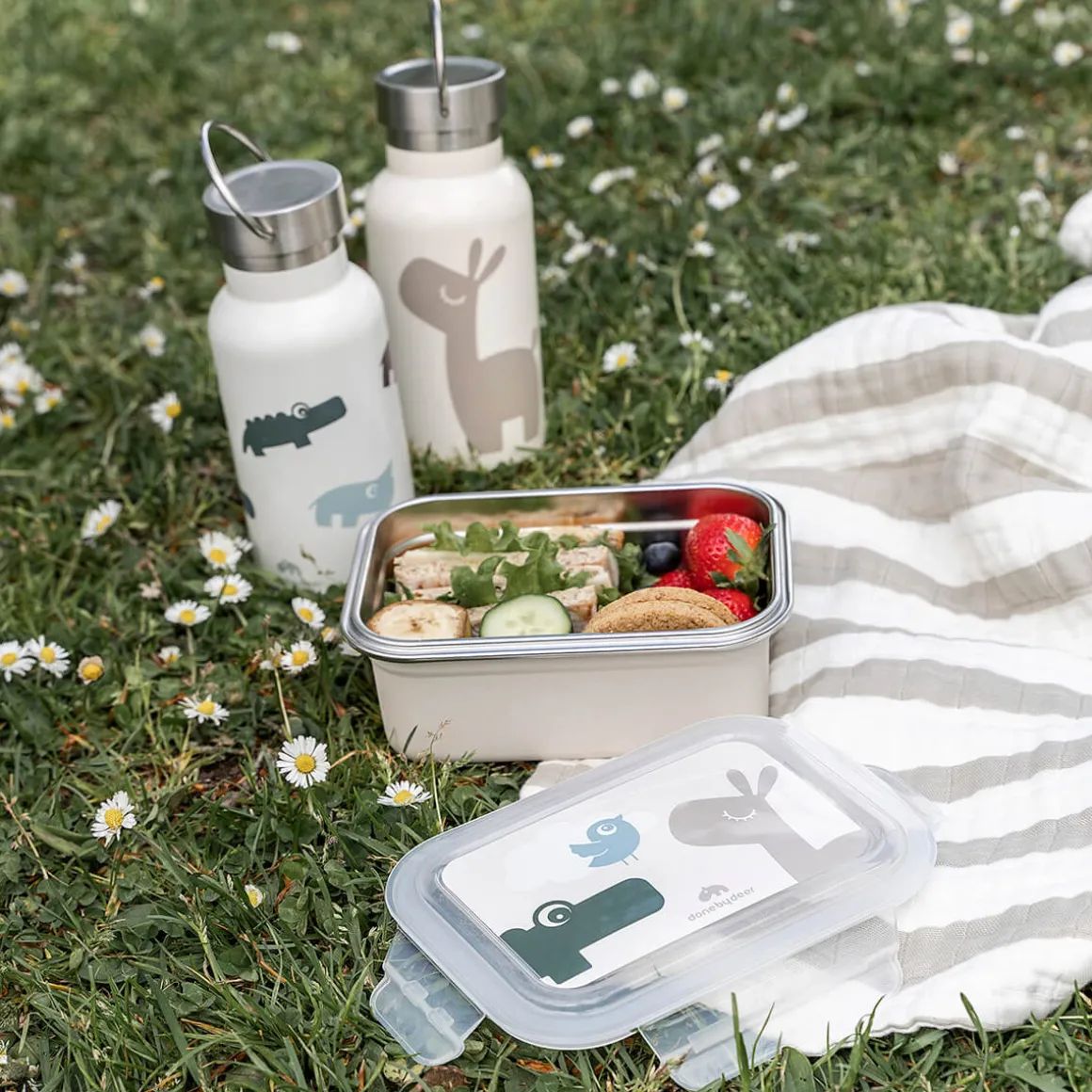 La lunch box en métal est d’un ton beige sable. Le couvercle est décoré des amis Deer Croco, Lalee et Birdee dans des tons doux de vert, de sable et de bleu.