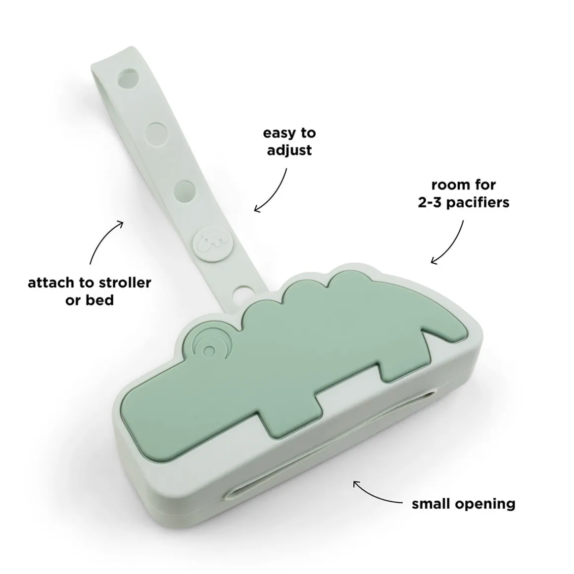 L’étui à sucettes Croco, dans les tons verts, est fabriqué en silicone souple et peut contenir 2 ou 3 sucettes. Doté d’une sangle ajustable permettant de l’attacher facilement à un landau ou à un sac à langer, cet étui garantit que les sucettes de votre bébé restent propres, qu’elles sont accessibles et faciles à trouver.