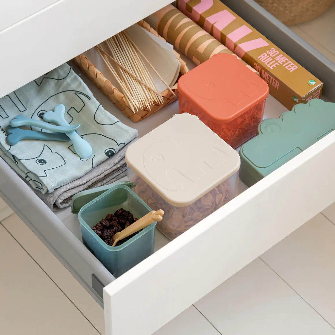 Les récipients semi-transparents peuvent être utilisés par toute la famille. Les couvercles sont dotés de douces écailles en croco pour faciliter l’ouverture et les récipients sont adaptés au congélateur, au micro-ondes et au lave-vaisselle. Les couleurs sont même assorties à nos lunch boxes.