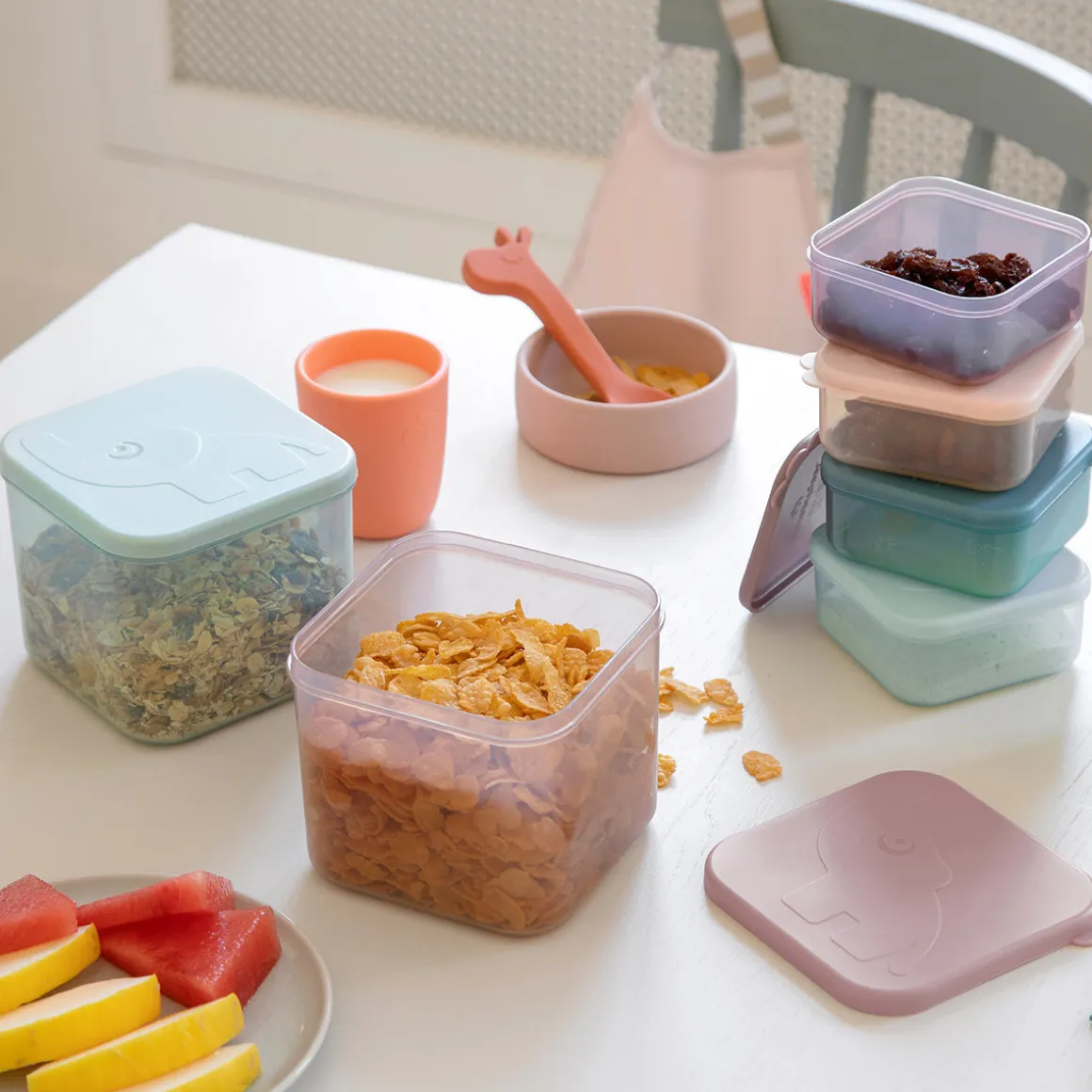 Emballez les plats préférés de la famille dans ces boîtes de conservation translucides aux couleurs poudrées. Les couvercles ont de douces écailles en croco pour une ouverture facile et ils sont embossés avec des motifs d’Elphee et de Birdee.