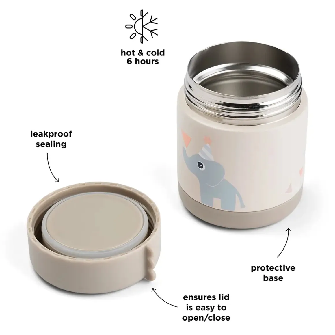 Qu’il s’agisse de bouillie chaude pour les matins d’école maternelle ou de salade de fruits fraîche pour un pique-nique ensoleillé dans un parc, ce bocal isotherme est conçu pour conserver les plats préférés de votre enfant à la bonne température jusqu’à six heures. Conçu pour les journées chargées et les petites mains, le bocal est facile à ouvrir et à fermer de manière autonome, ce qui aide les tout-petits à prendre confiance en eux à l’heure des repas. Un joint en silicone sûr maintient le pot étanche à l’air et aux fuites, de sorte que vous pouvez le mettre dans n’importe quel sac sans avoir à vous inquiéter.
