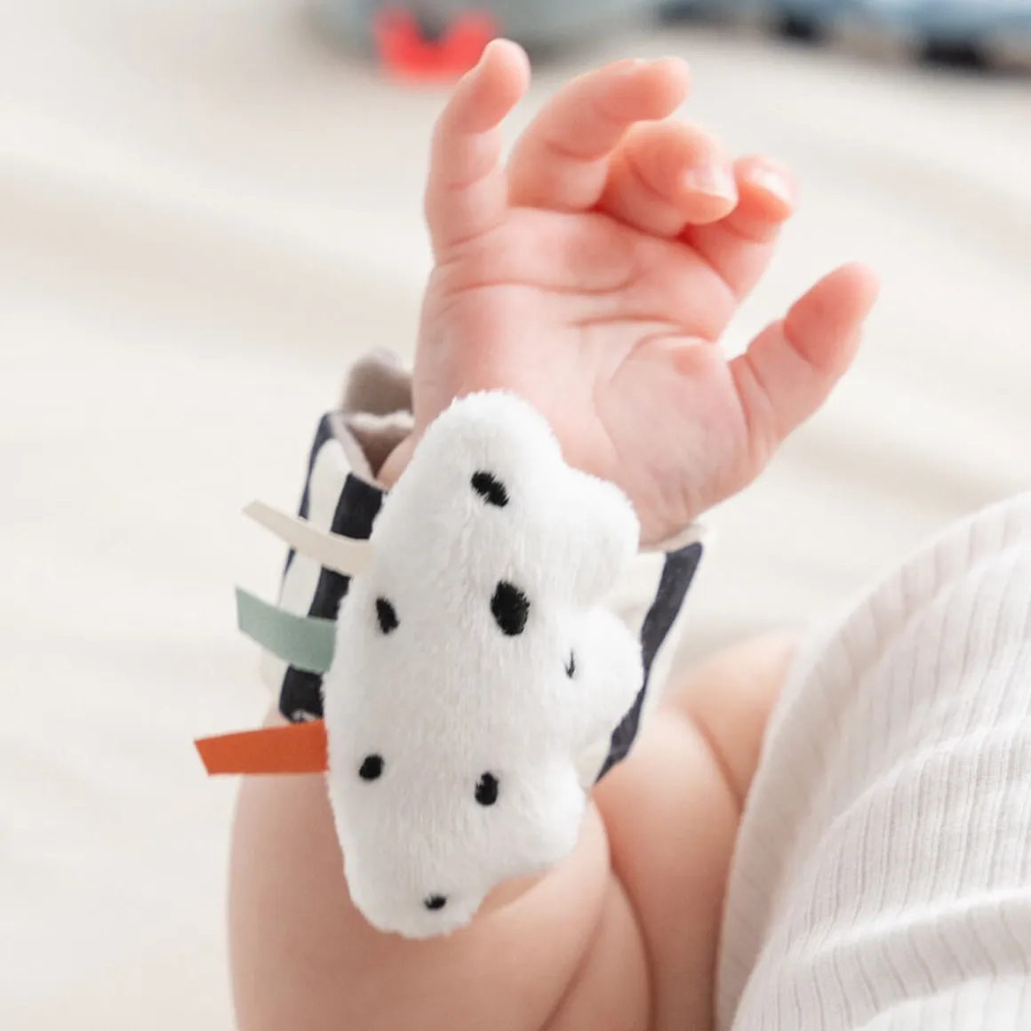Le set de hochets Happy clouds comprend deux bracelets souples pour bébé avec des détails bleus, idéaux à partir de 0 mois. Conçus pour la stimulation sensorielle, l’éveil corporel et la reconnaissance des mains, ces bracelets présentent des points contrastés, des rayures et des éléments colorés pour un engagement visuel. Les sons de hochet et de papier bruissant ajoutent au plaisir auditif.