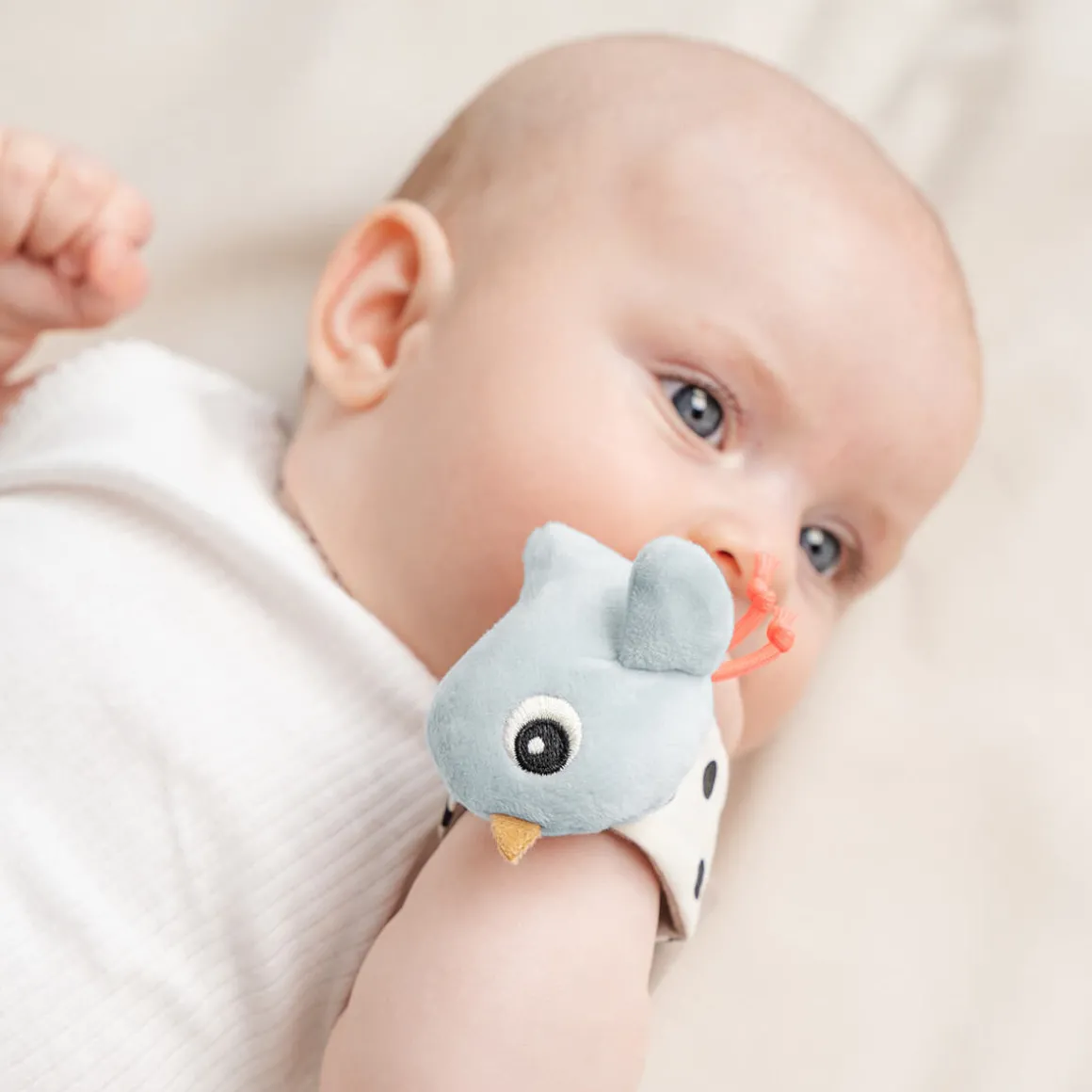 – Le set de hochets Happy Clouds se compose de 2 bracelets souples pour bébé avec des détails bleus.
