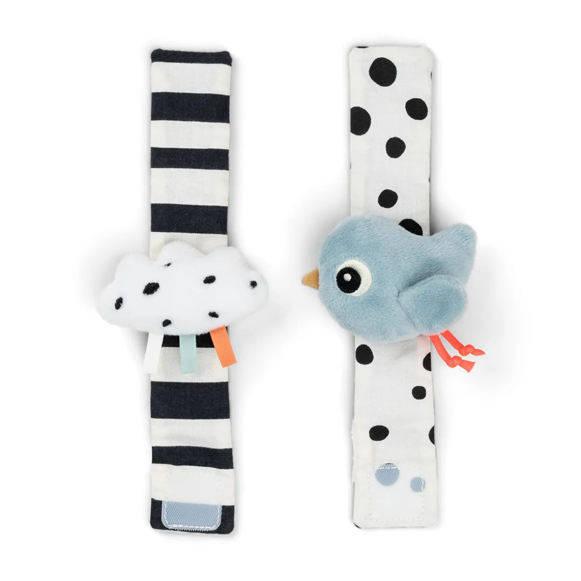 L’un des bracelets présente des points et une birdee bleue, l’autre des rayures et un nuage. Dotés d’une fermeture velcro pour les porter et les retirer facilement, ces hochets conviennent aussi bien aux poignets qu’aux chevilles. Améliorez l’expérience sensorielle de votre bébé avec cet accessoire ludique et réglable, conçu pour les activités d’éveil.