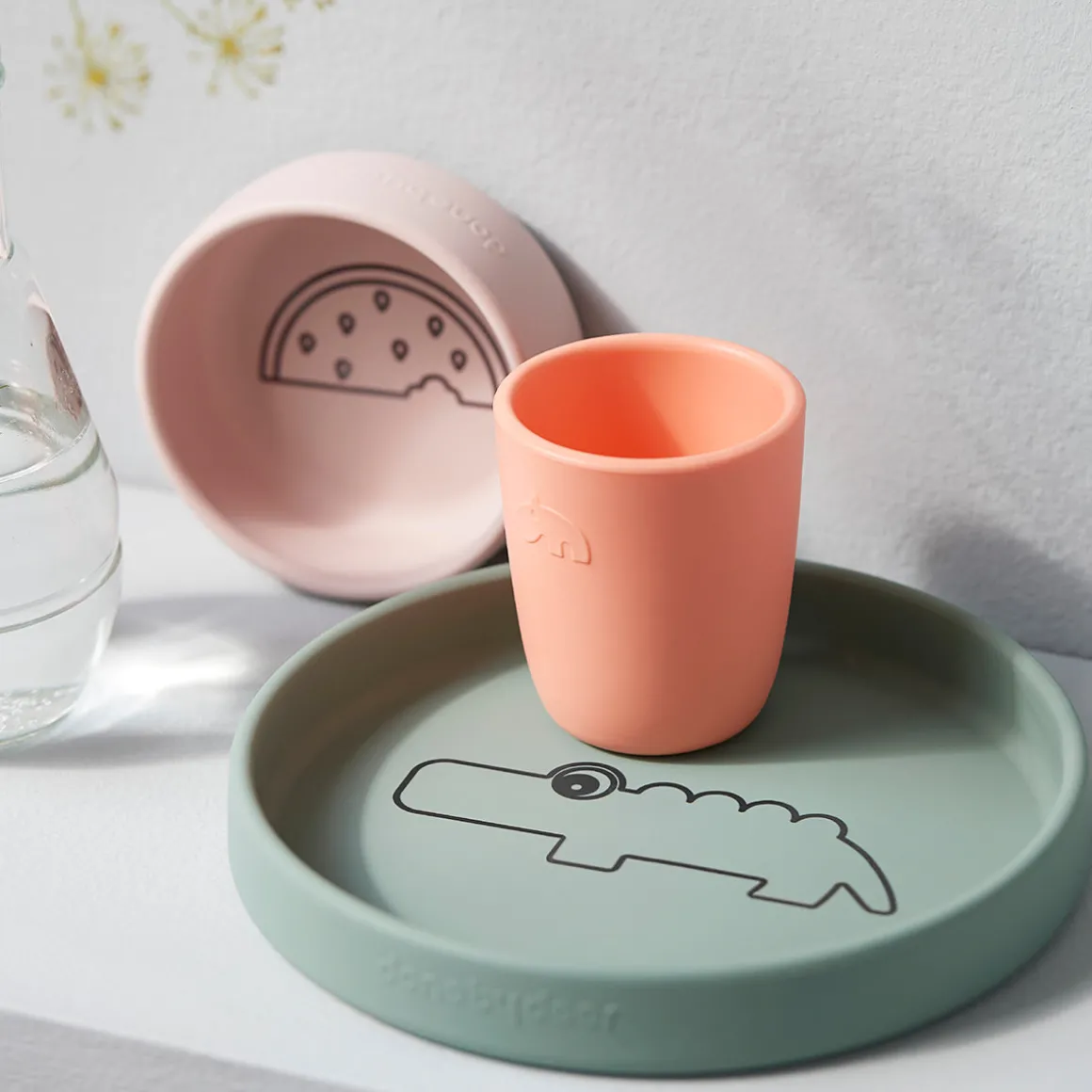 Une assiette verte Croco, un bol en forme de pastèque poudrée et une mini tasse rouge corail fraîche font de ce coffret repas une idée de cadeau parfaite pour les petits mangeurs.