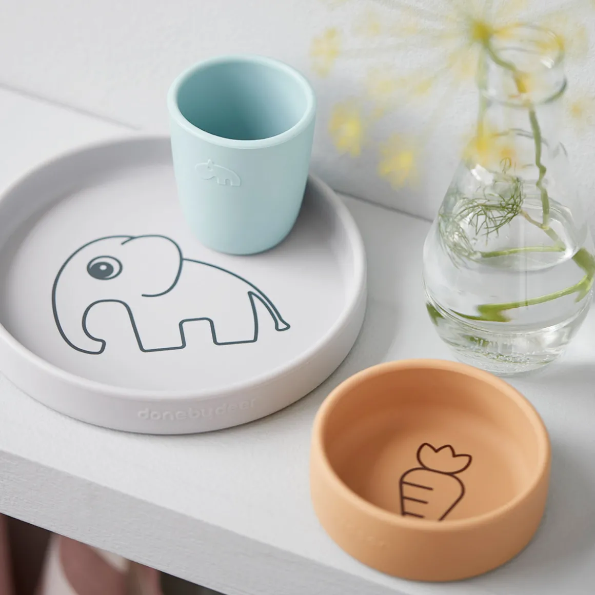 Une assiette grise Elphee, un bol à carottes moutarde et une mini tasse bleu clair font de ce coffret repas une idée de cadeau parfaite pour les petits mangeurs.