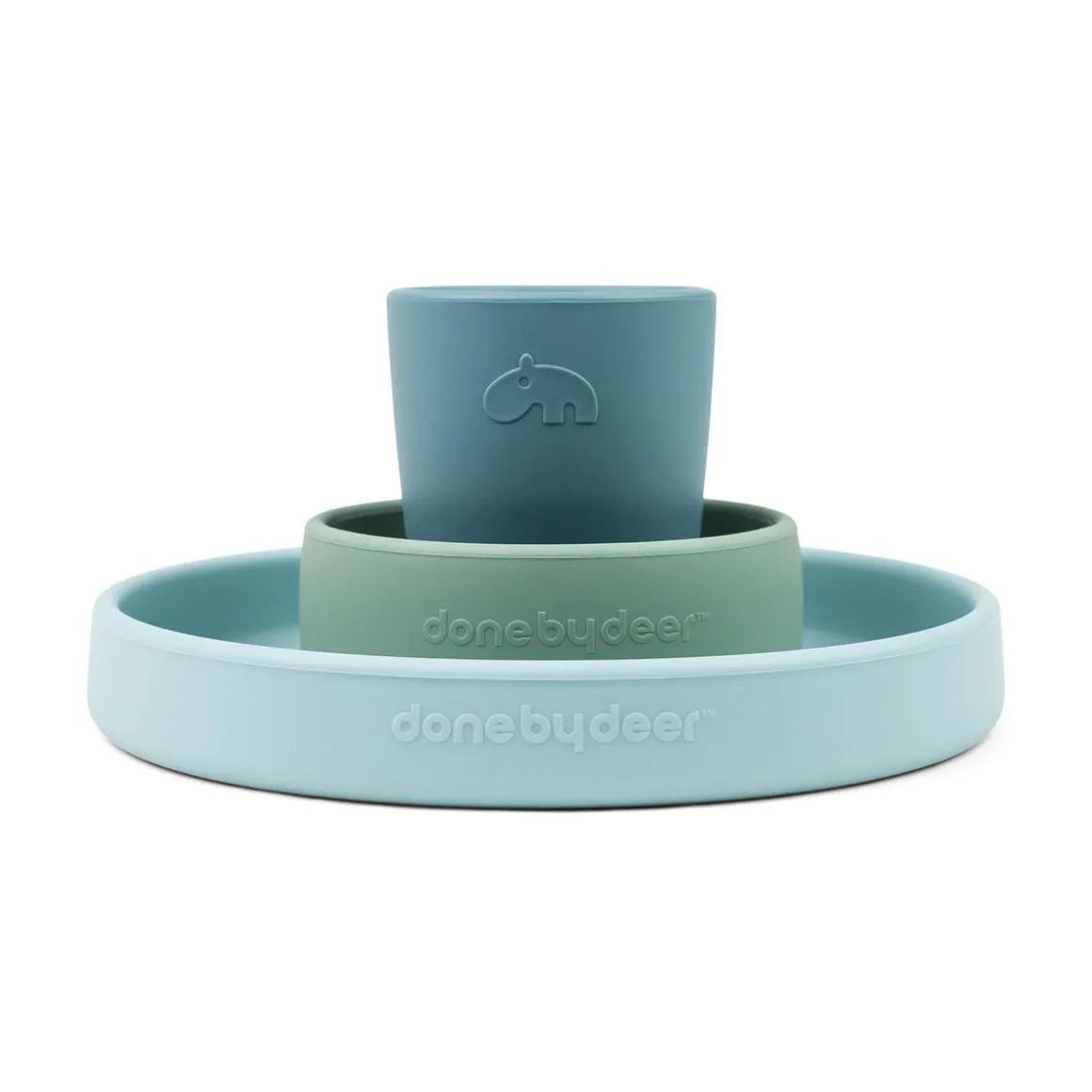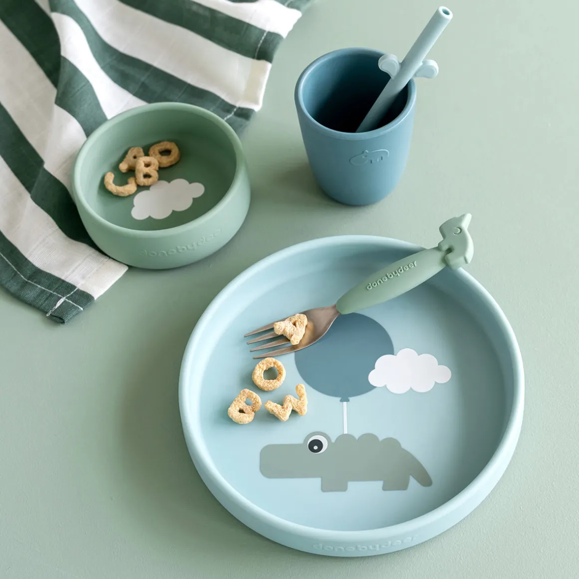 Une assiette Croco bleue, un bol Vert/Vert et une mini tasse bleu foncé font de ce set de repas pour enfants une idée de cadeau parfaite pour les petits mangeurs.