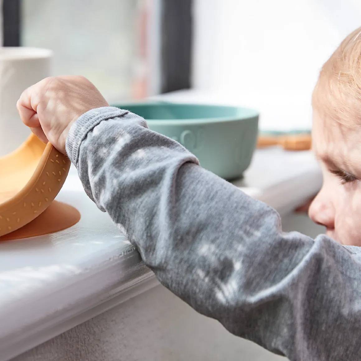 – Les assiettes et les bols sont munis de ventouses qui maintiennent la vaisselle en place pendant le repas.