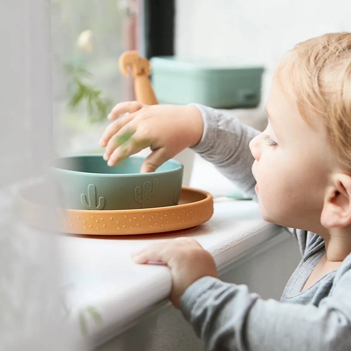 Dressez une table amusante avec le coffret repas Silicone Stick&Stay et Lalee comme compagnon cool. L’assiette moutarde, le bol vert et la mini tasse sable sont décorés de motifs en relief avec Lalee, Birdee, des confettis festifs et des cactus pétillants.
