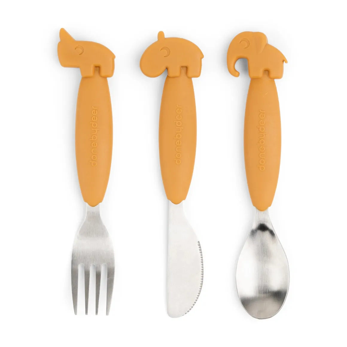 Le couteau Ozzo, la fourchette Nozo et la cuillère Elphee sont assortis à l’ensemble de la collection de vaisselle Done by Deer.