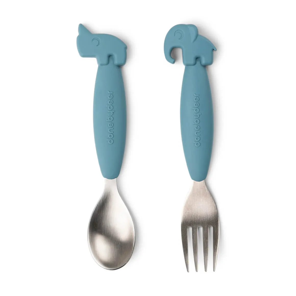La fourchette Elphee et la cuillère Nozo bleues sont assorties à l’ensemble de la collection de vaisselle Done by Deer.