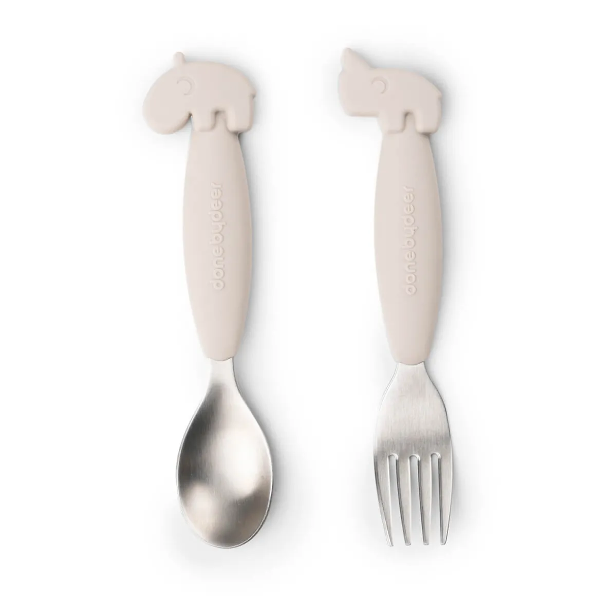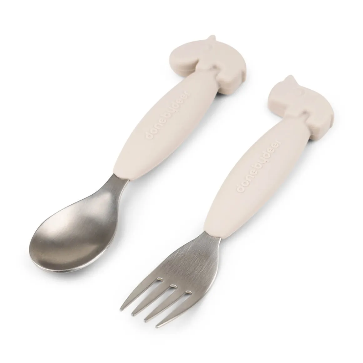 La fourchette Nozo et la cuillère Ozzo sont assorties à l’ensemble de la collection de vaisselle Done by Deer.
