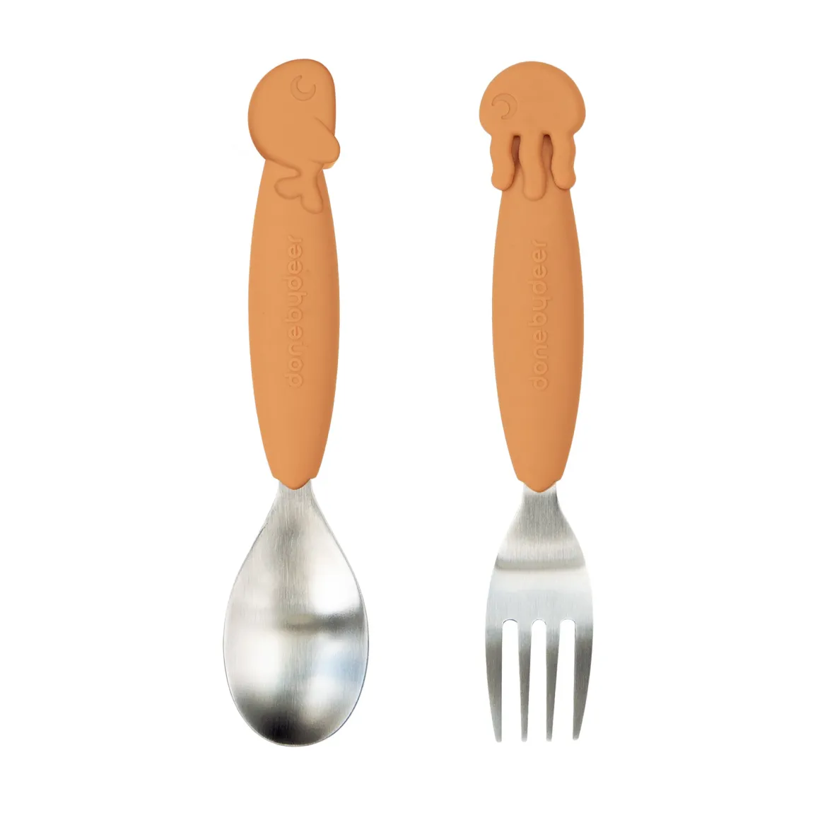 Les couverts Sea Friends sont d’une couleur moutarde chaude, assortie à la vaisselle pour enfants Done by Deer.