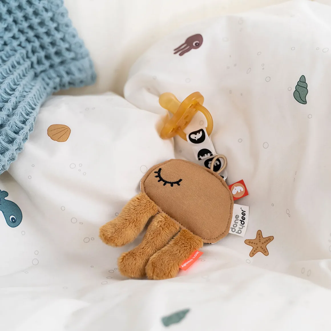 L’adorable méduse sera un compagnon de sommeil familier pour votre bébé et veillera à ce qu’aucune sucette ne s’envole. Le Cozy keeper est doté d’une attache velcro pratique et d’une boucle élastique pour attacher les sucettes avec ou sans poignée.