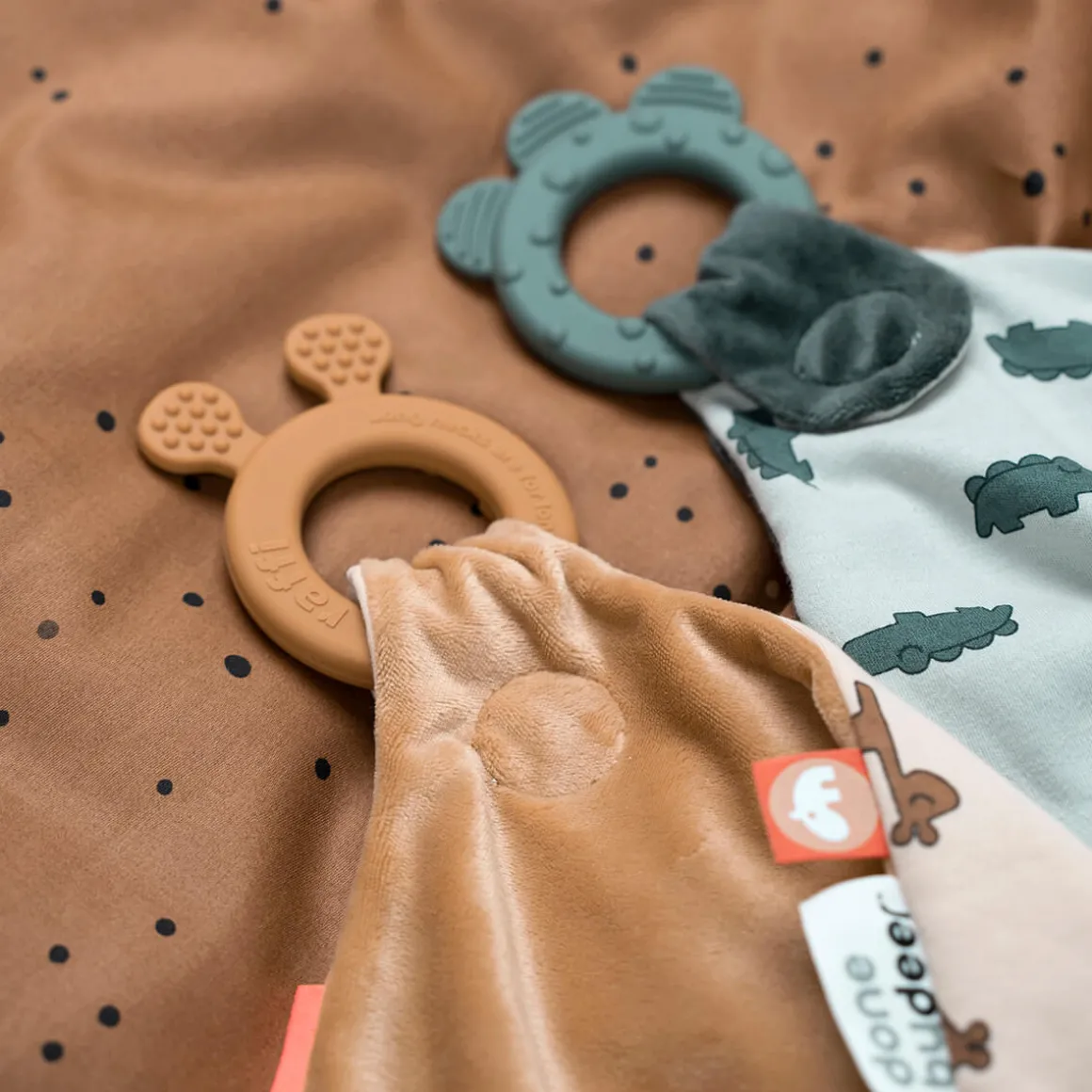 Le mignon anneau de dentition en silicone avec des oreilles de girafe et différentes textures pour stimuler et apaiser les démangeaisons des gencives peut être détaché et utilisé seul. Une attache velcro pratique et une boucle élastique permettent d’attacher une sucette pour la garder à portée de main.