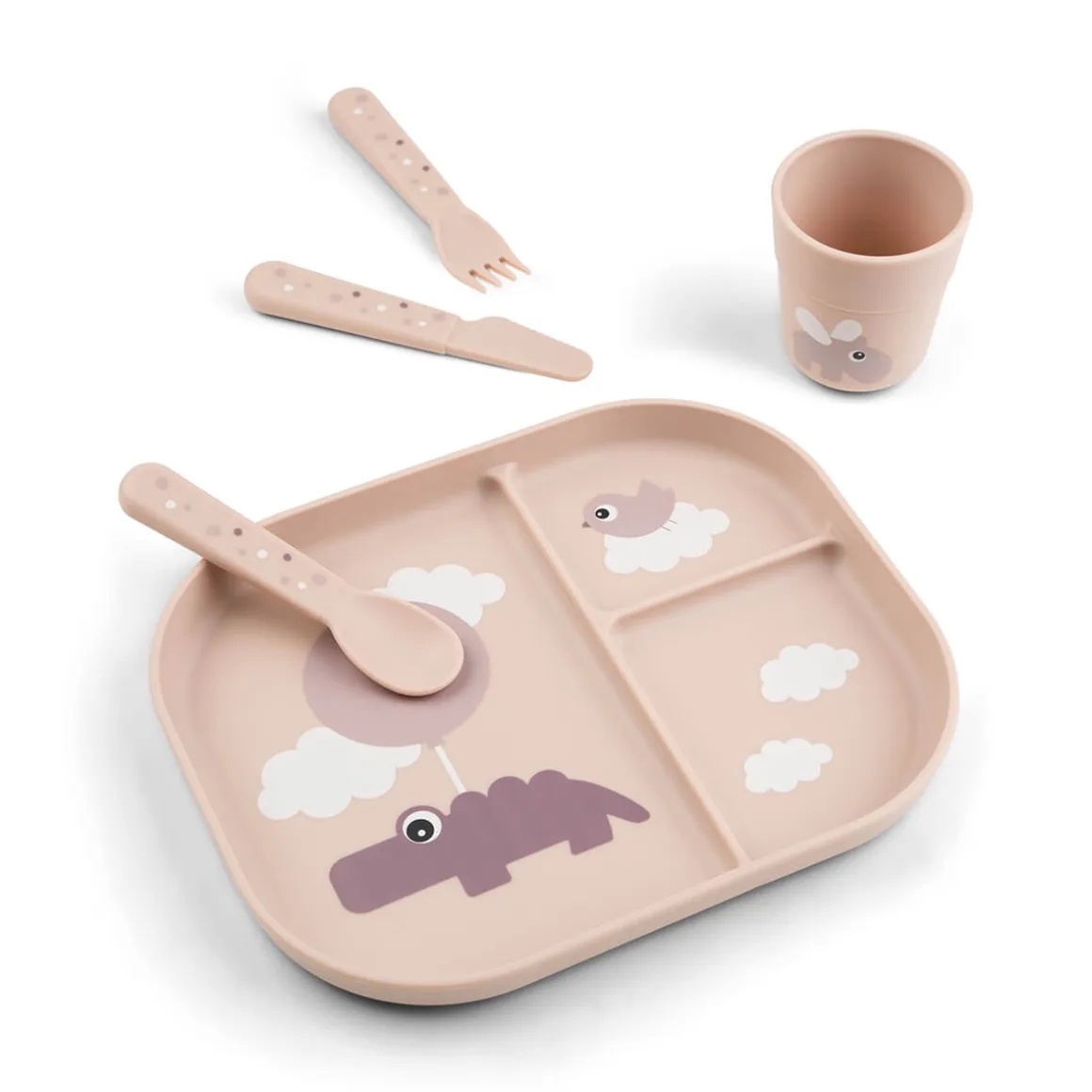 L’ensemble Rose est imprimé d’un motif ludique Happy clouds. Croco, Ozzo et Birdee explorent le monde parmi les nuages et invitent votre enfant à découvrir de nouvelles saveurs et consistances.