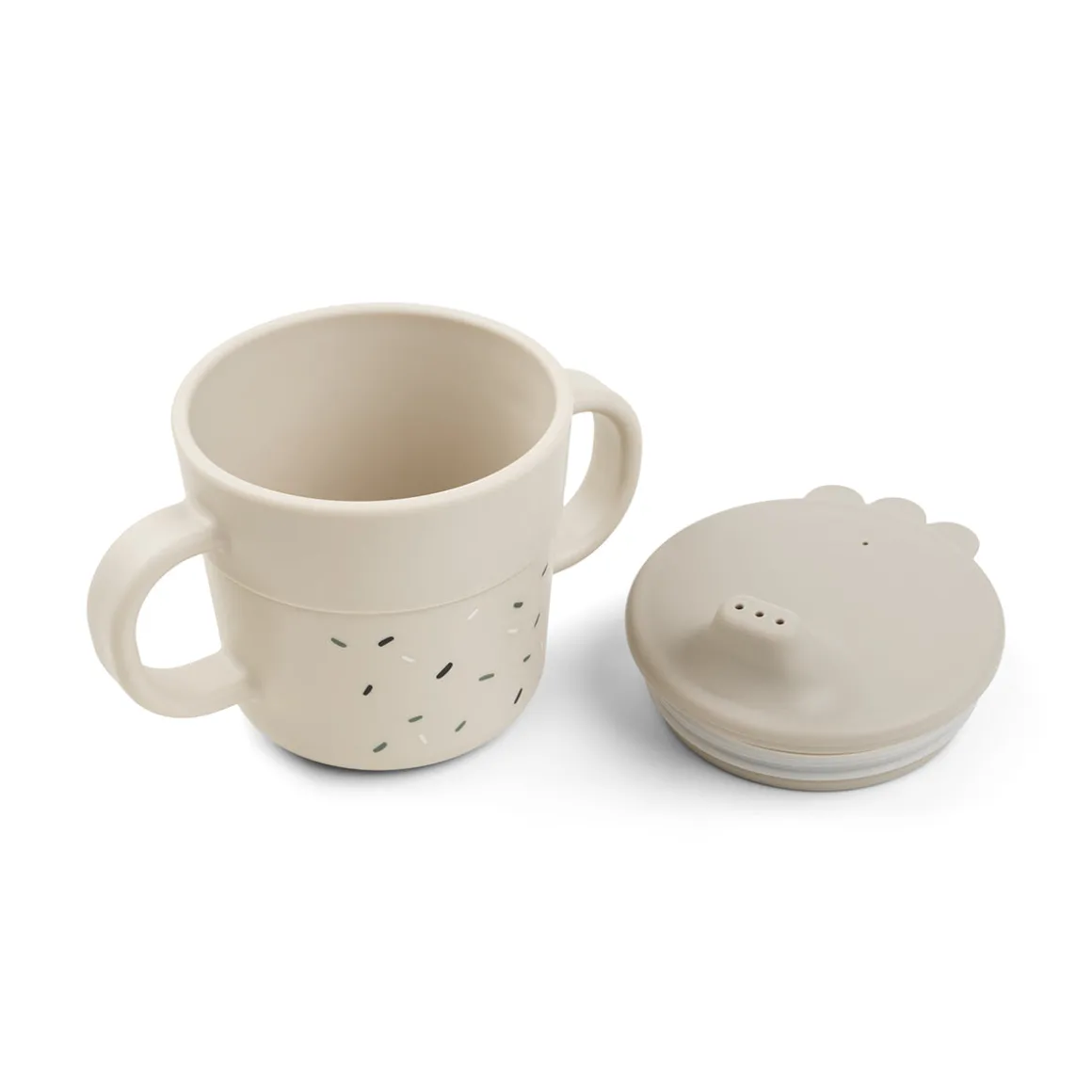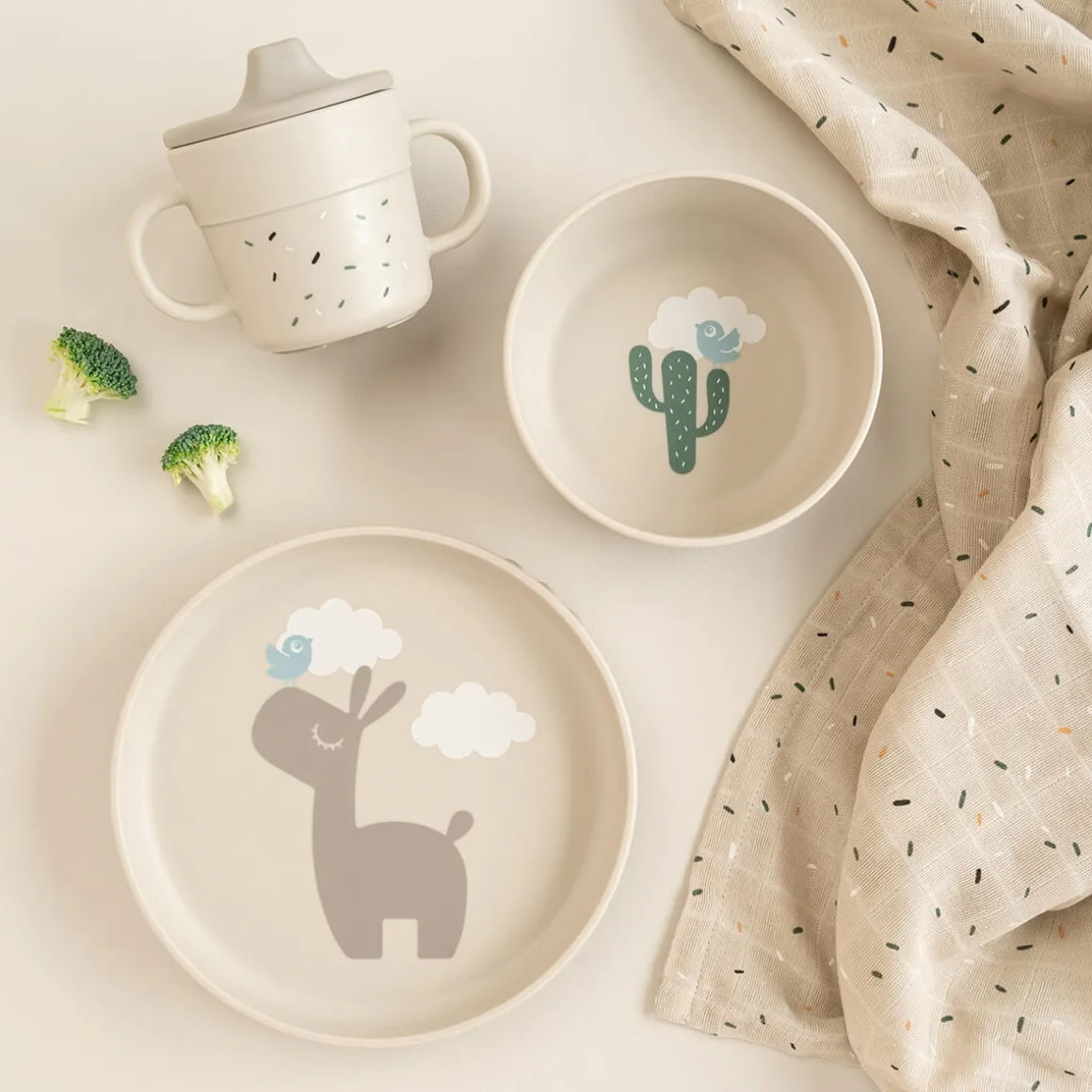Le coffret repas de couleur sable est orné d’une jolie impression. L’assiette est ornée d’un motif représentant Lalee et Birdee, tandis que le bol représente Birdee sur un cactus. Des confettis ont été dispersés sur le bol et la tasse d’apprentissage à deux anses. Les éléments sable plus foncés ajoutent un joli détail bicolore.