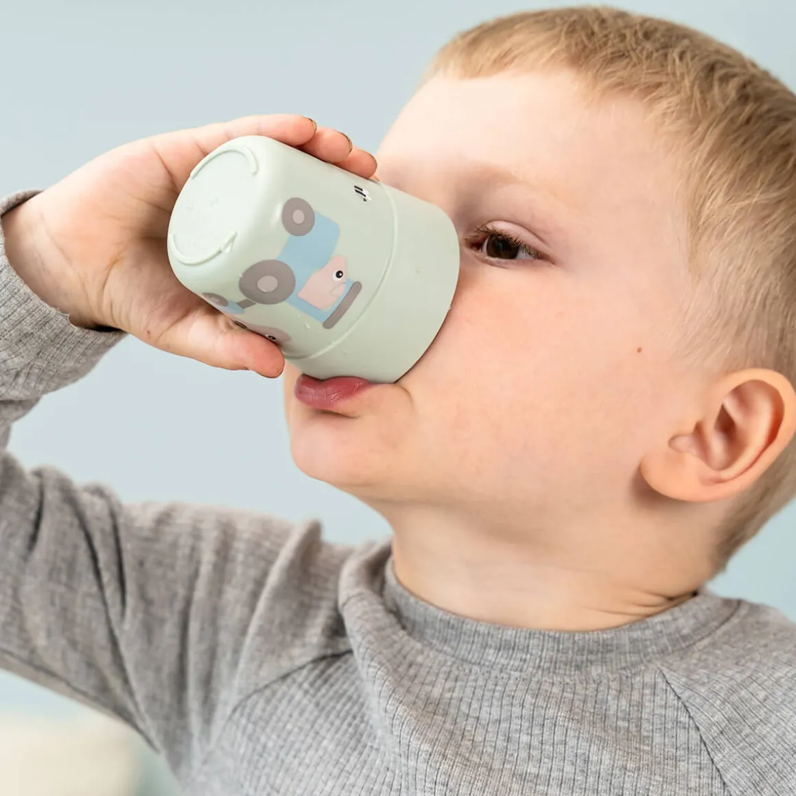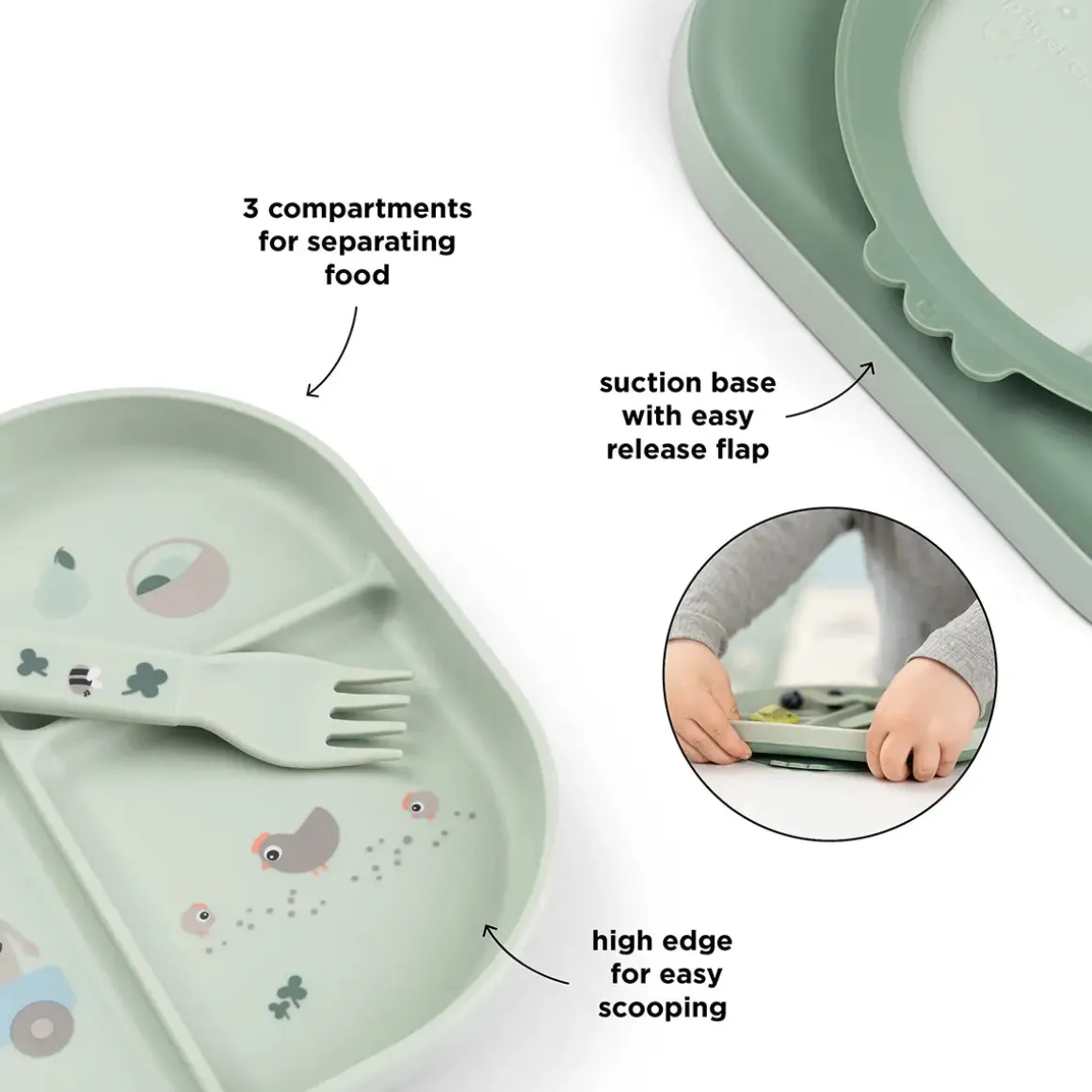 Les trois compartiments permettent de séparer les différentes saveurs et couleurs, ce qui encourage les petits mangeurs curieux à goûter tout ce qu’il y a dans leur assiette. Les bords hauts sont conçus pour aider les petites mains à saisir chaque bouchée, ce qui favorise l’autonomie à l’heure des repas. La tasse assortie ainsi que la fourchette et le couteau de taille enfant tiennent parfaitement dans les mains des enfants, faisant de chaque repas une aventure pleine de confiance.