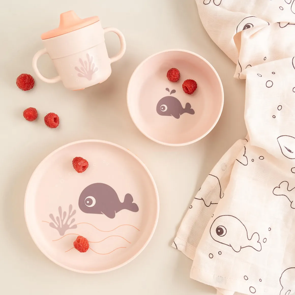 Le coffret repas Rose est orné d’un motif représentant Wally en expédition sous-marine. La tasse d’apprentissage à deux anses est décorée de coquillages et d’étoiles de mer. La couleur Corail ajoute un joli détail bicolore et le bol présente de chouettes vagues. Laissez votre enfant plonger.
