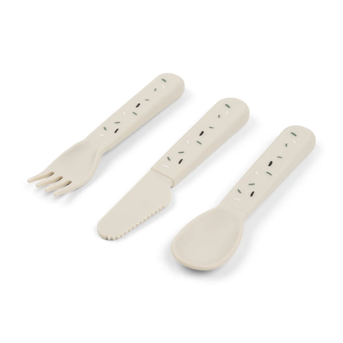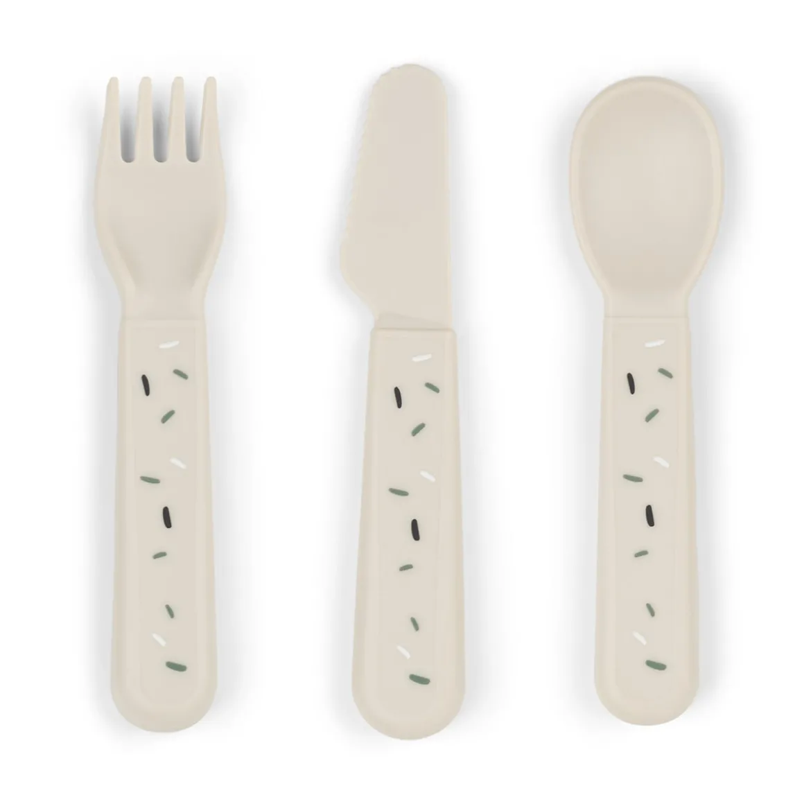 – Contient une cuillère, une fourchette et un couteau de couleur sable avec impression de confettis.