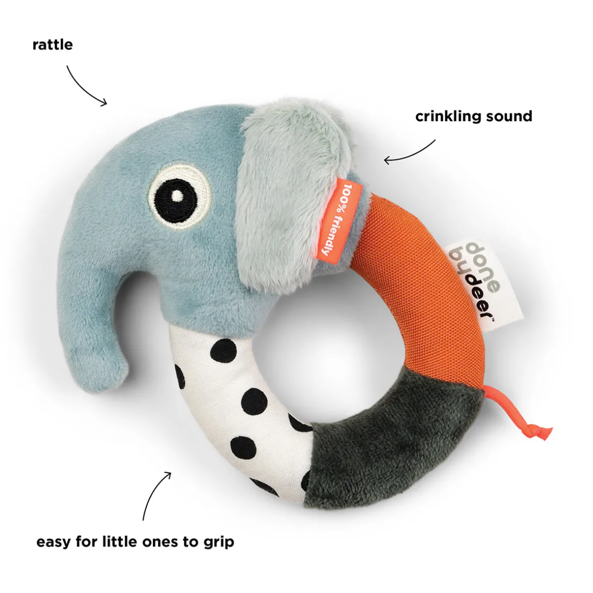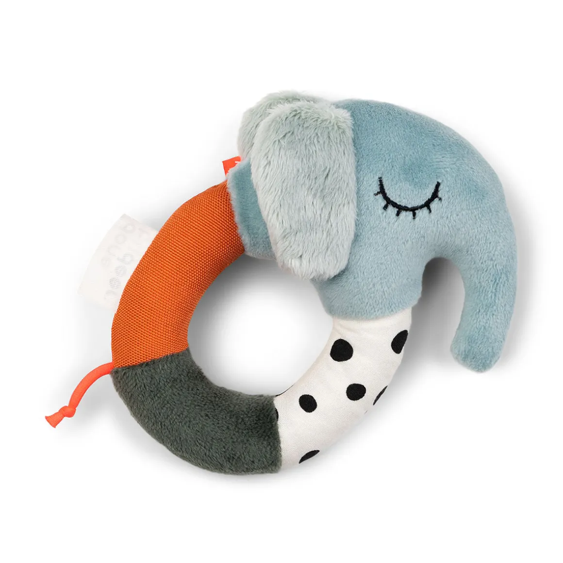 Le hochet à anneau souple comporte de multiples éléments qui stimulent votre bébé. Les nombreuses couleurs et textures le rendent amusant à regarder et à toucher. Elphee fait un joli bruit de hochet lorsqu’on le secoue, et les oreilles produisent un drôle de papier bruissant.