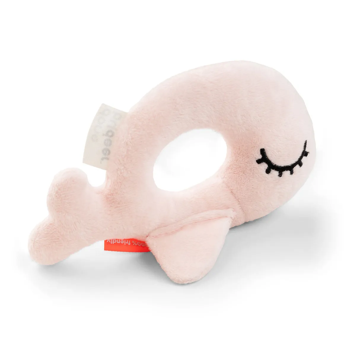 Le hochet en forme d’anneau fait un joli bruit de hochet lorsqu’on le secoue et les nageoires font un drôle de papier bruissant lorsqu’on les touche. Les ailettes permettent au hochet de tenir debout tout seul et conviennent à l’heure du ventre.