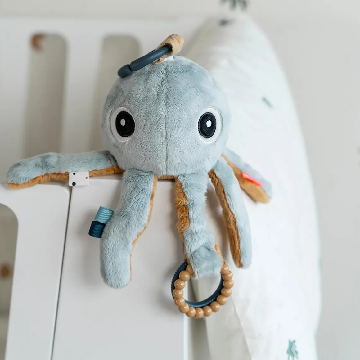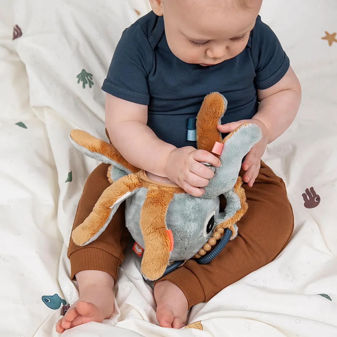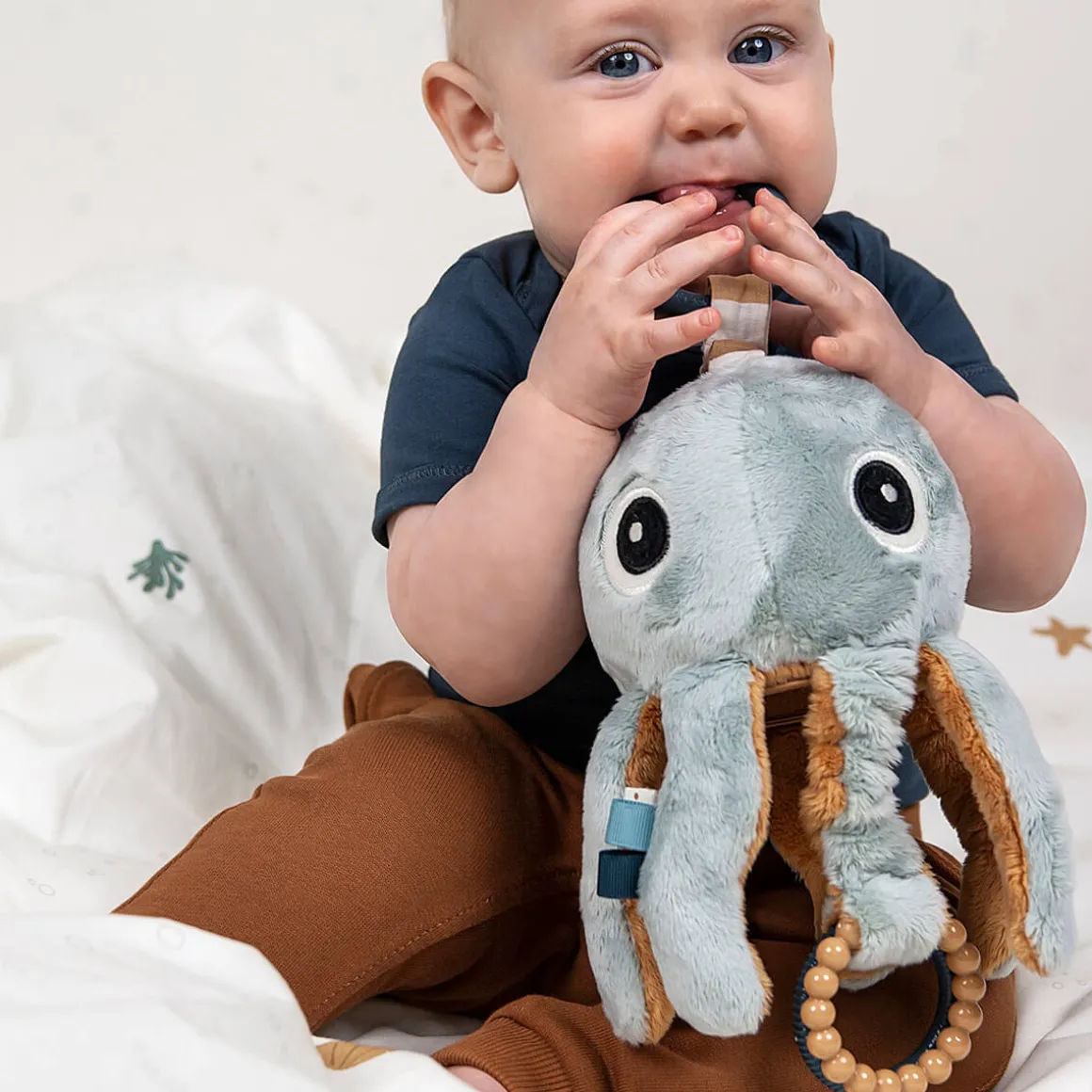 Grâce au toylink, vous pouvez attacher l’adorable méduse à un landau, une poussette, un siège auto ou un parc – toujours à portée de main de votre enfant. Activity Jelly est d’un bleu doux avec des couleurs contrastantes sur l’intérieur de ses bras.