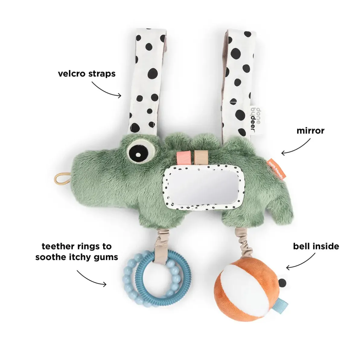 Easy to attach to a car seat handle using Velcro straps, this toy is perfect for keeping your baby entertained during car rides. The cool green colour, colourful details, and contrasting elements offer visual stimulation, while a Croco adds comfort and joy throughout the journey.
