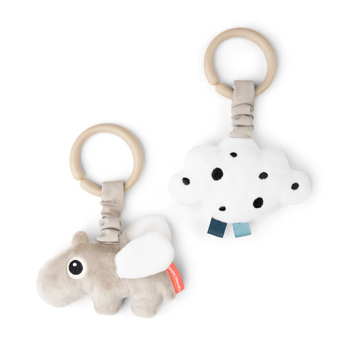 L’ensemble de jouets d’activité à suspendre est composé d’un Ozzo de couleur sable et d’un nuage blanc avec des Black dots, tous deux munis d’un élastique en sable.