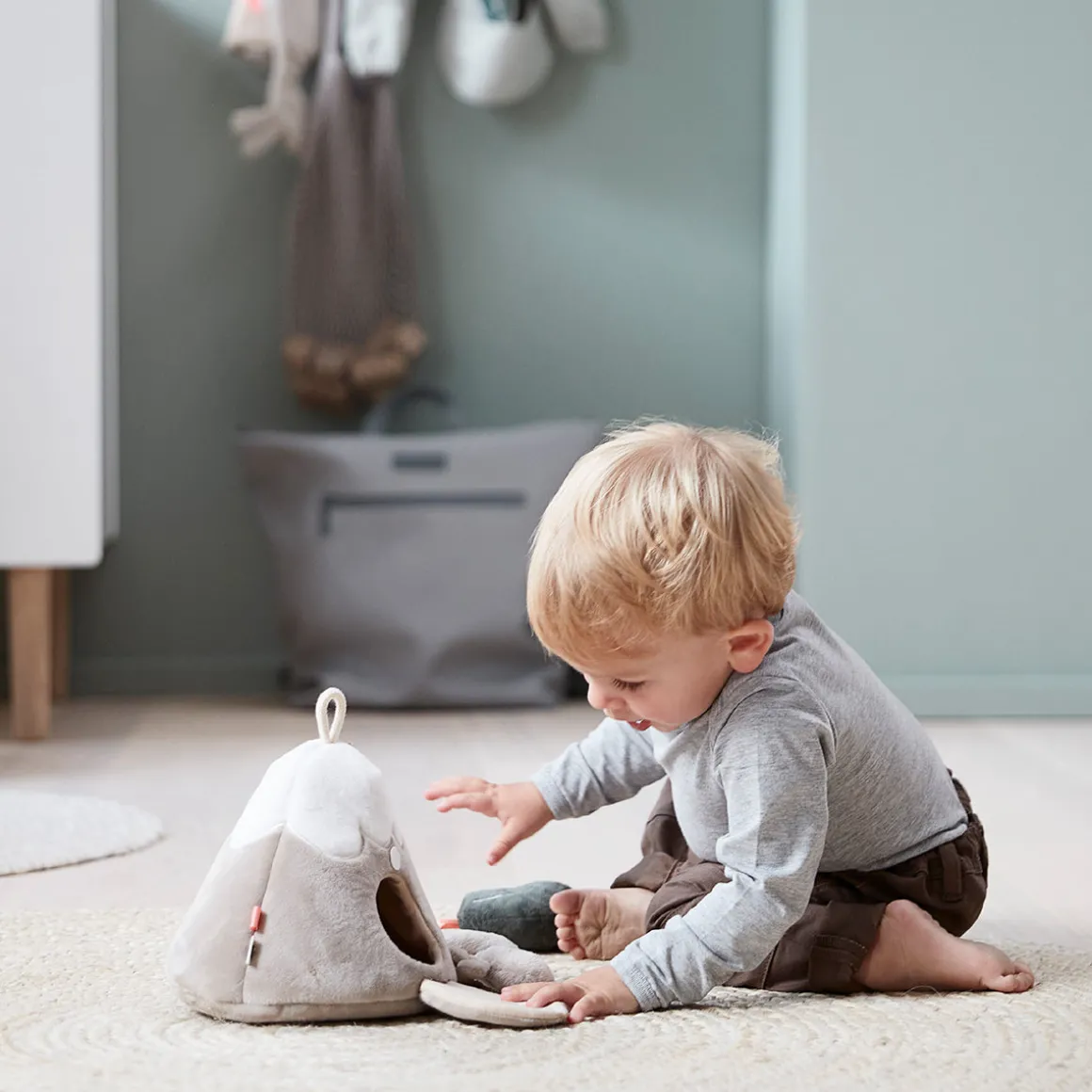 La montagne de cache-cache et les petits jouets d’activité sont dans des tons doux de sable, de bleu, de vert et d’une touche de rouge corail.
