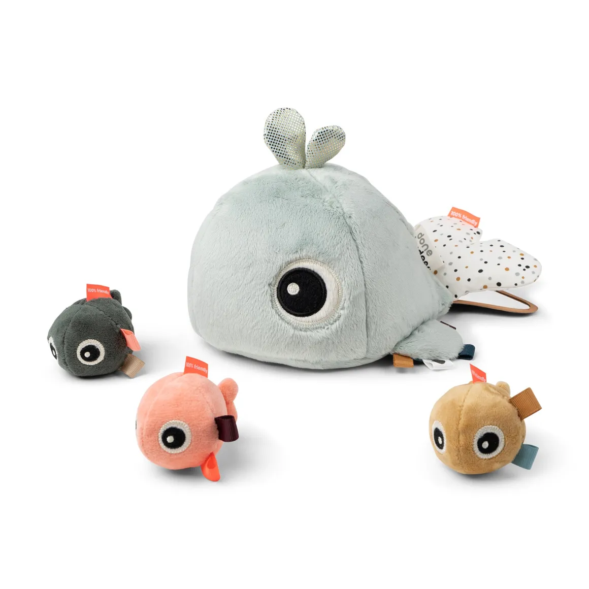 Le jouet d’activité cache-cache amusera les tout-petits, tout en développant leurs capacités de concentration et leur coordination œil-main. Le jouet baleine bleu menthe super doux est recouvert de points passionnants sur la nageoire et a des petits amis poissons dans des couleurs amusantes.
