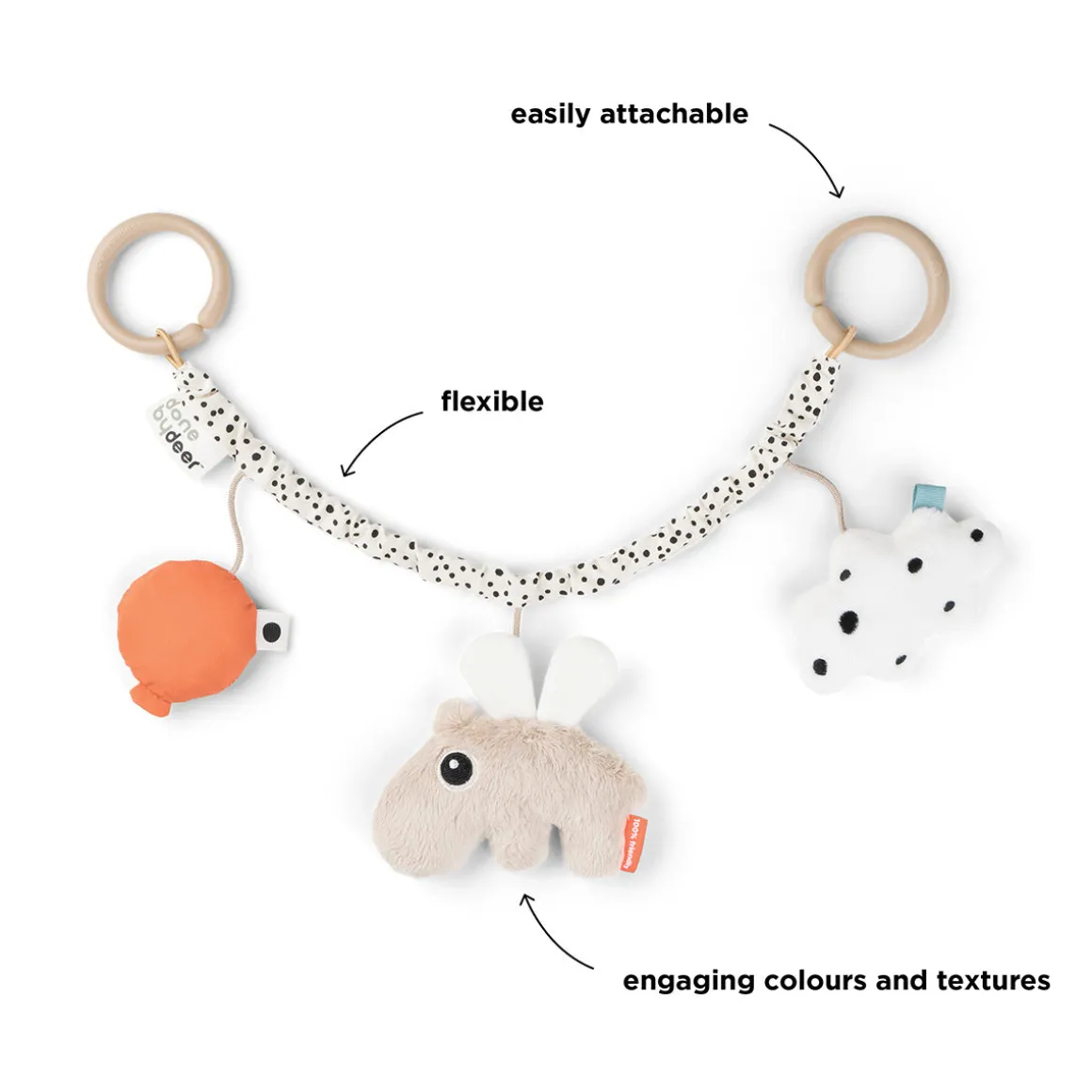 – Facile à emporter et à attacher au landau, à la poussette ou à un centre d’activités