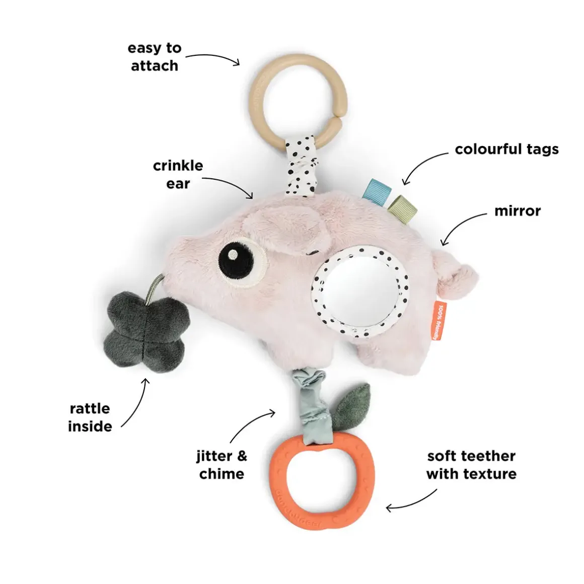 This sensory activity toy is full of exciting features to engage your baby’s senses. With a rattle, chime, and crinkle, it stimulates hearing and touch, while the mirror invites your little one to discover themselves. Pulling the apple-shaped teether activates a fun jitter, adding extra delight to playtime.