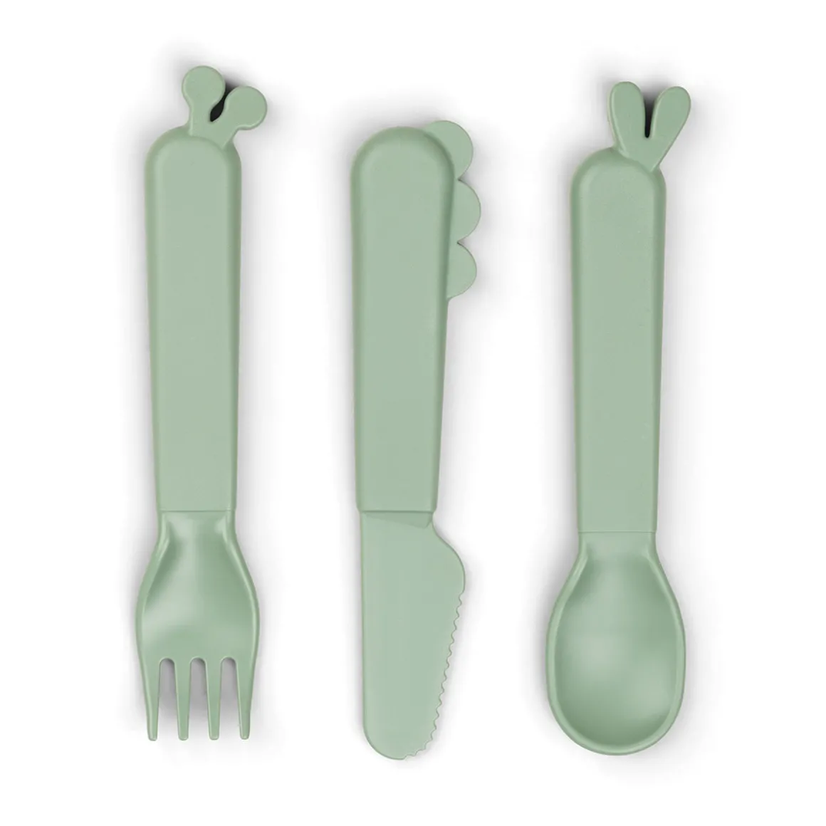 – Set de couverts comprenant une cuillère avec des oreilles de Lalee, une fourchette avec des oreilles de Raffi et un couteau avec les écailles de Croco.