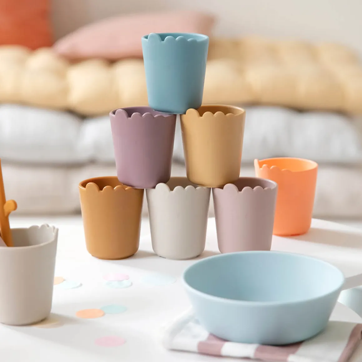 Les tasses recyclables pour enfants sont fabriquées au Danemark. Après d’innombrables repas en famille, fêtes et pique-niques, les tasses peuvent être triées par plastique dur et recyclées pour fabriquer de nouveaux produits pour la vie de tous les jours.