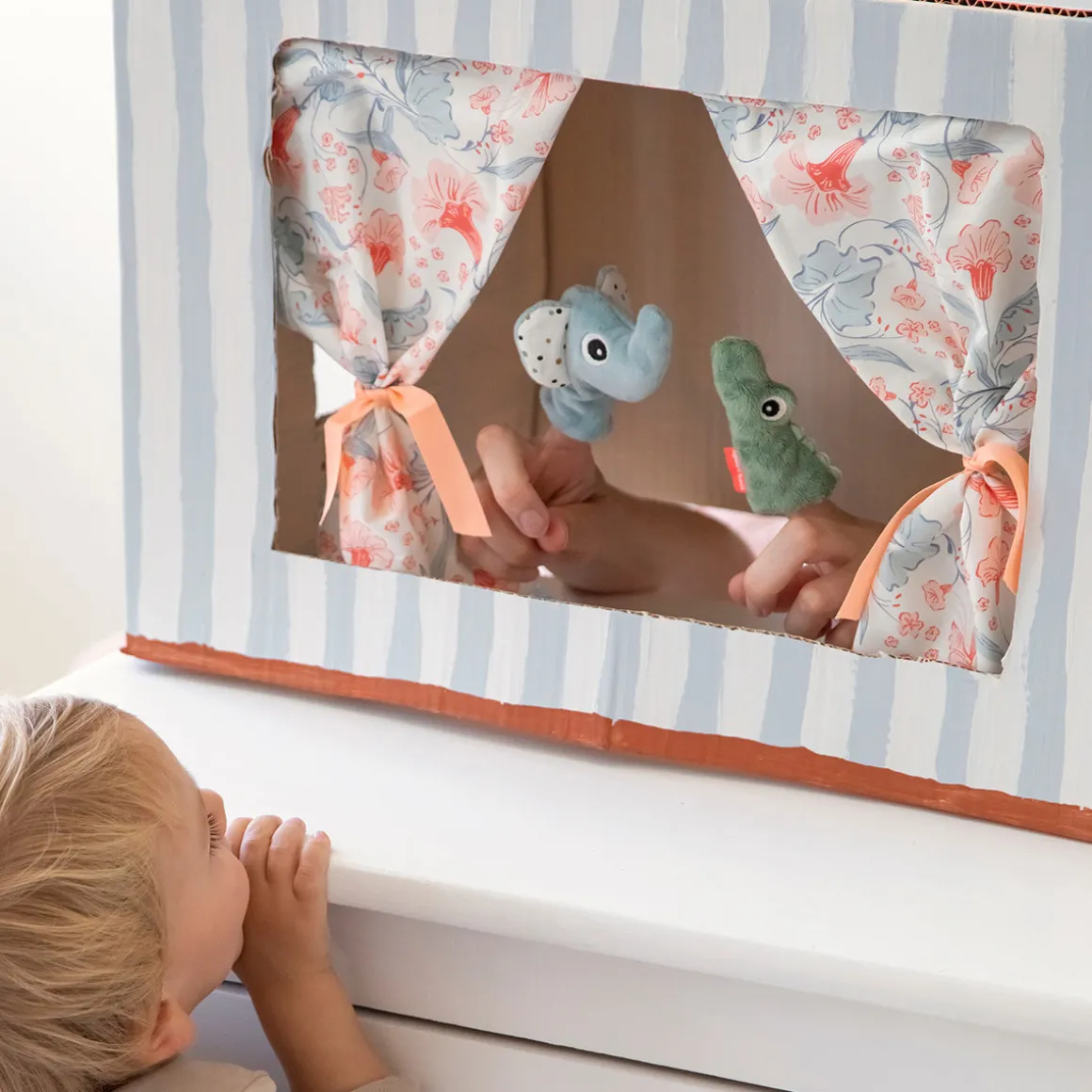 Les trois marionnettes à doigt sont fabriquées dans des couleurs ludiques et sont prêtes à entrer dans le monde imaginaire de n’importe quel enfant. Les marionnettes sont à double face pour que tout le monde puisse profiter du spectacle.