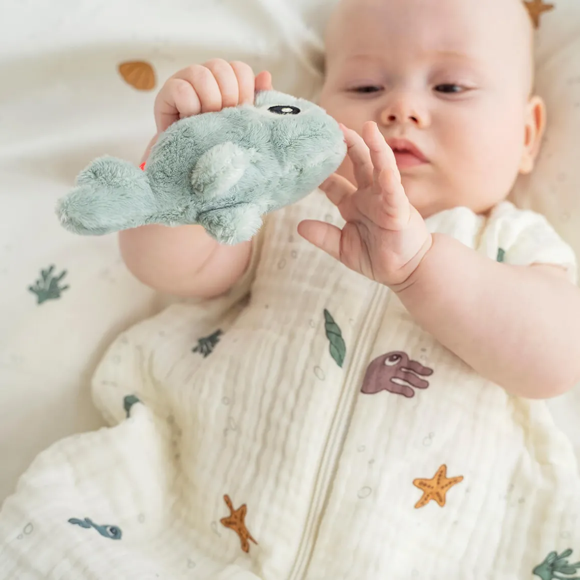 Grâce à la boucle élastique, il est facile d’attacher le petit hochet sensoriel à un tapis d’éveil, à une poussette, à un siège auto ou à un centre d’activités à l’aide d’un lien pour jouets. Le petit hochet baleine super doux est d’un ton bleu tendre.