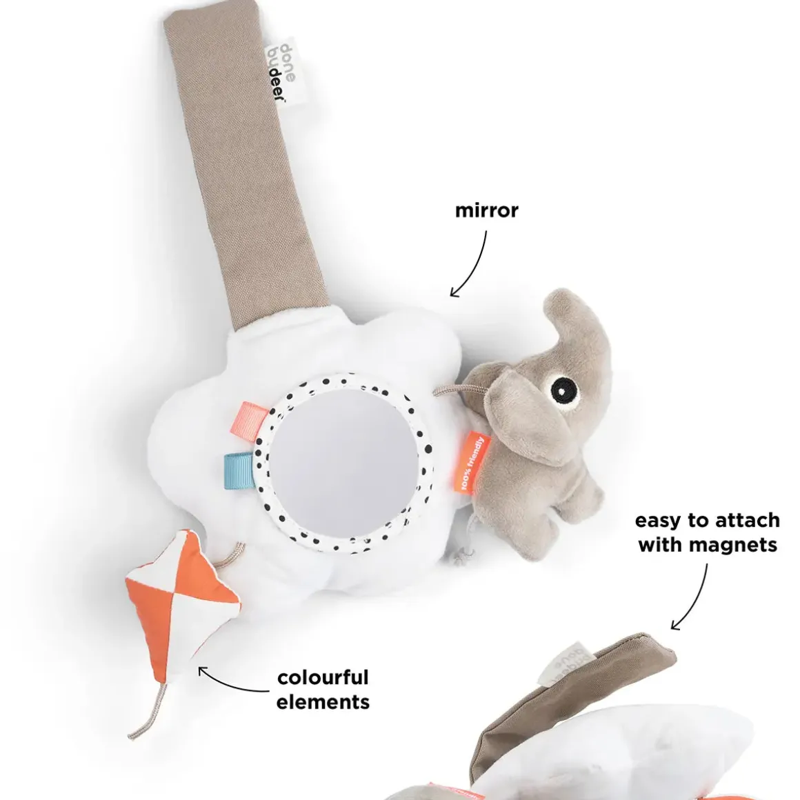 This delightful pram mobile keeps your little one entertained and engaged while on the go. Featuring Elphee, the kite, and a mirror for fun reflections, it captures your baby’s attention and sparks curiosity.