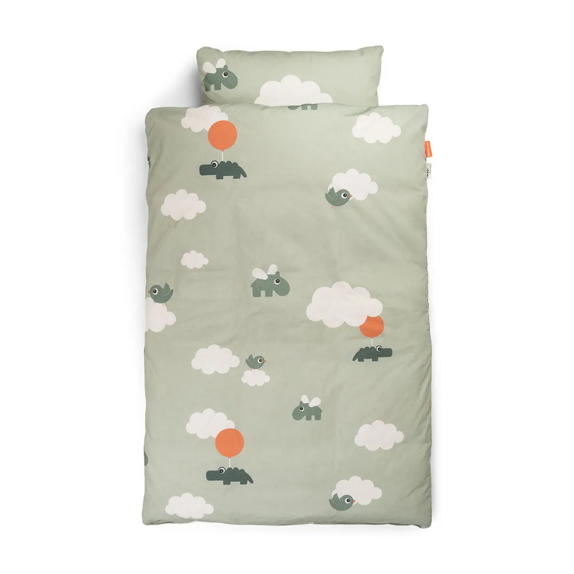 La parure de lit est d’un vert tendre et présente de jolis motifs de birdee, d’ozzo et de croco, ainsi que des éléments de rêve tels que des nuages et des ballons.