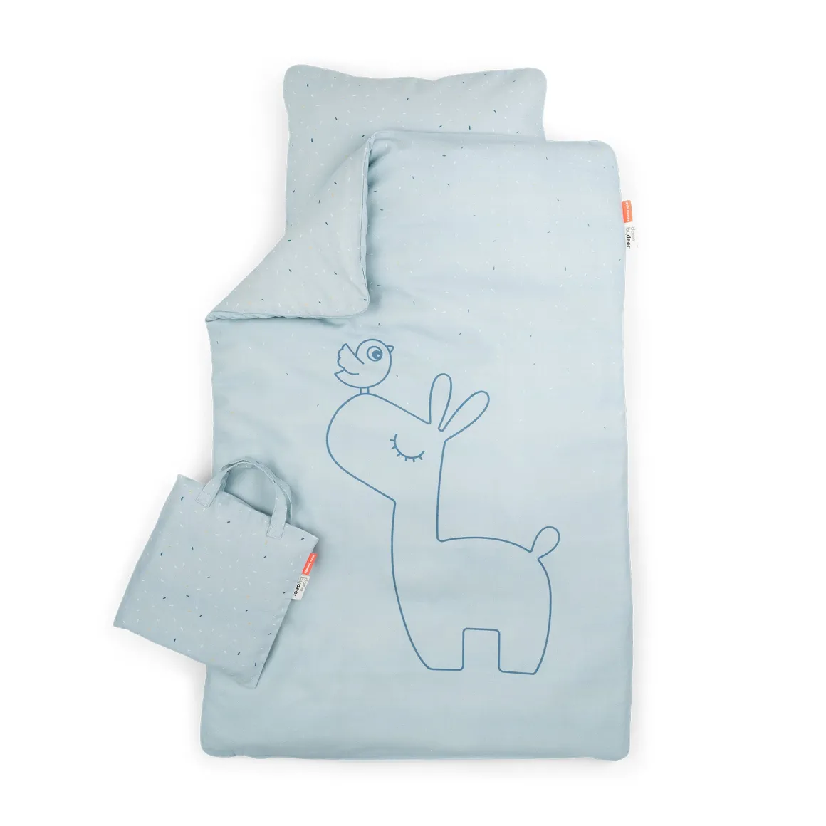 Le linge de lit en lama est emballé dans un petit sac fourre-tout assorti au linge de lit et pouvant servir à ranger des jouets, des vêtements de rechange, des chaussures ou d’autres objets pratiques. La literie est équipée d’une fermeture éclair de sécurité YKK pratique, tant pour la taie d’oreiller que pour la housse de couette.
