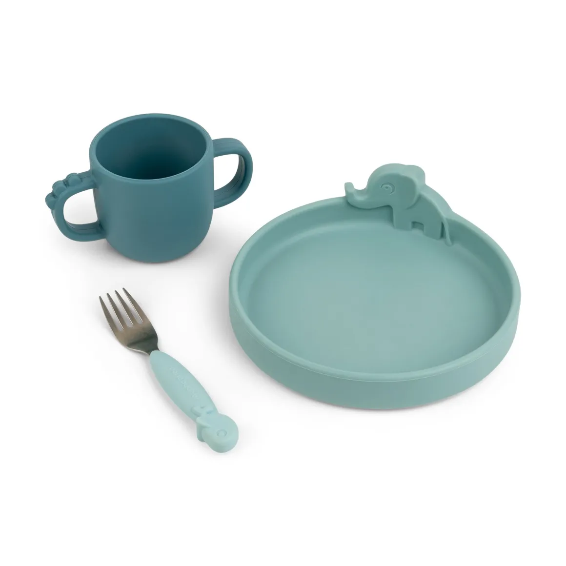 Les enfants apprécieront que les adorables animaux se joignent à eux à l’heure du repas – ils découvriront Croco au fond de leur tasse lorsqu’ils boiront et Elphee et Wally les aideront à franchir l’étape excitante qui consiste à manger tout seul. L’ensemble est dans des tons doux de bleu.