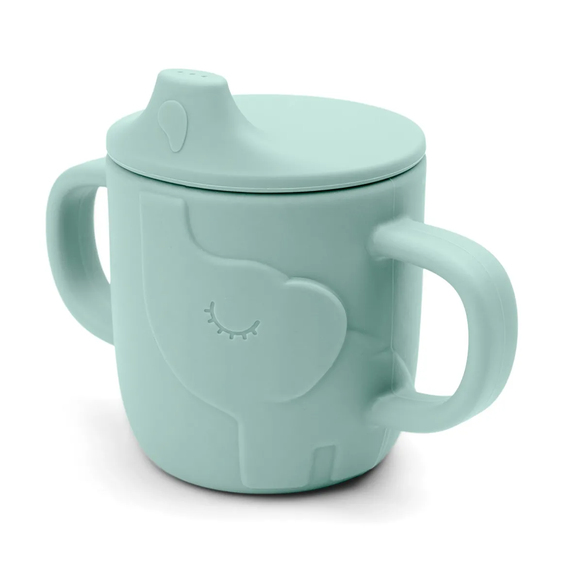 Elphee sort de la tasse d’apprentissage bleue en éclaboussant les tasses. Un accessoire idéal pour aller à la poussette, à la voiture ou au terrain de jeu.