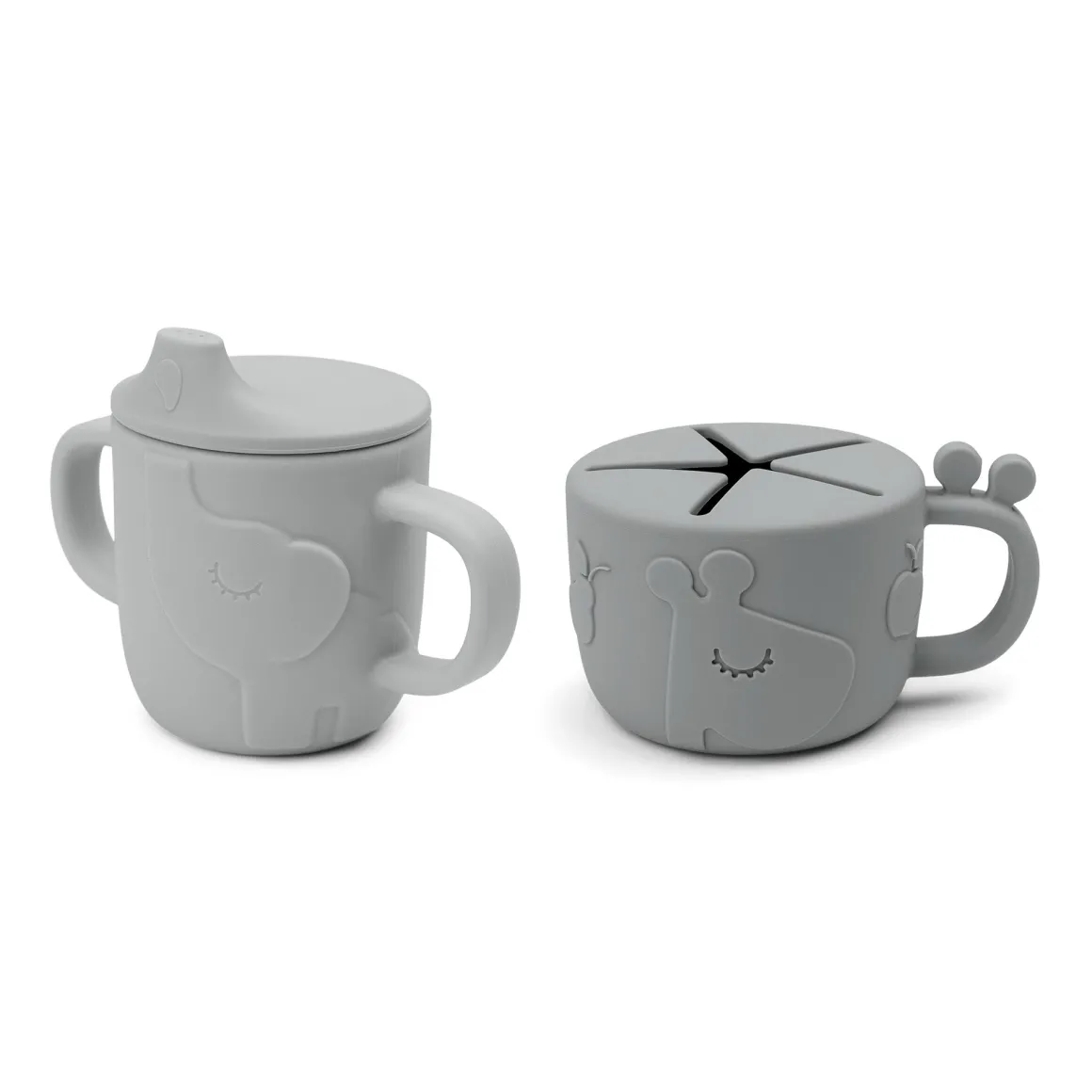 L’ensemble de tasses grises avec la girafe et l’éléphant est fabriqué en silicone alimentaire, ce qui le rend incassable et lui confère une bonne prise en main.