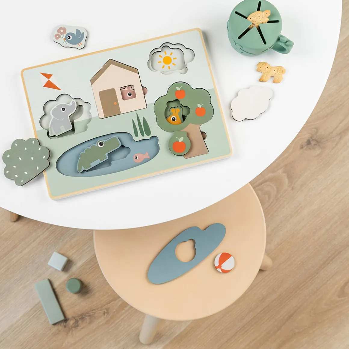 This fun puzzle is a wonderful way to help your little one train fine motor skills and pincer grasp as they lift each piece to discover what’s hidden underneath. It also encourages imagination, allowing them to create their own stories while developing logical thinking and problem-solving skills.