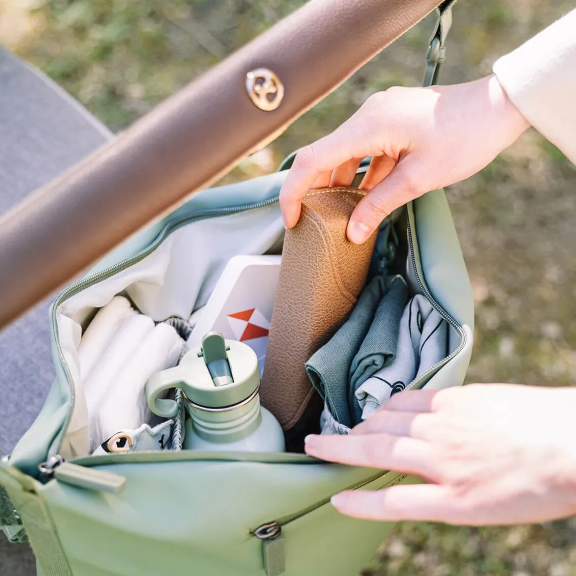 Ce sac de poussette Vert est un moyen pratique et élégant de garder vos affaires et celles de votre enfant organisées et facilement accessibles. Il se fixe sans effort à la poignée de la nacelle à l’aide des crochets pour poussette.