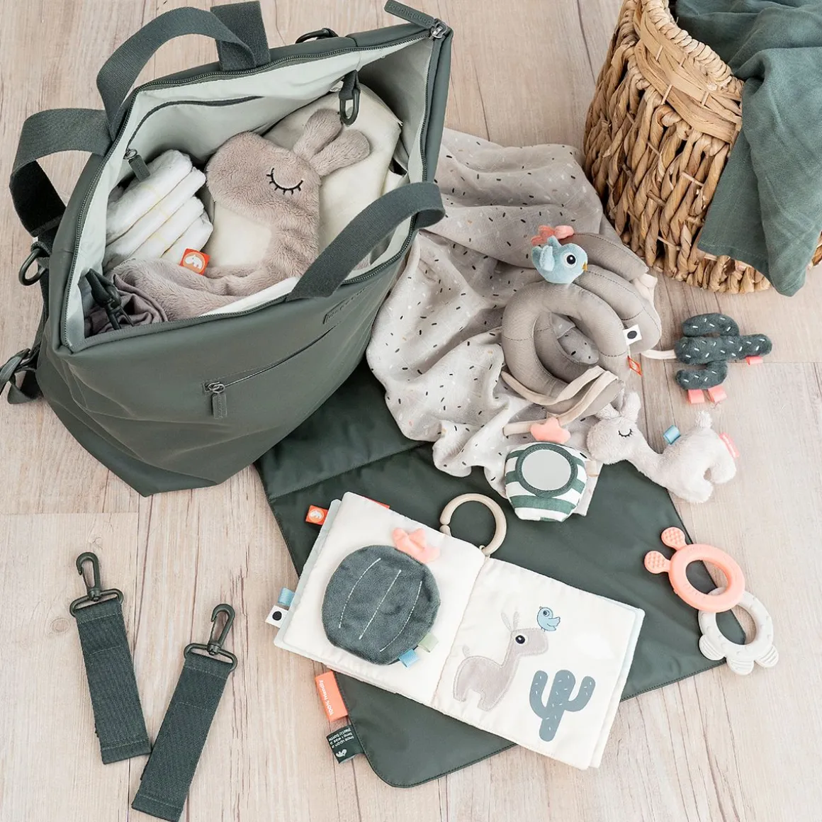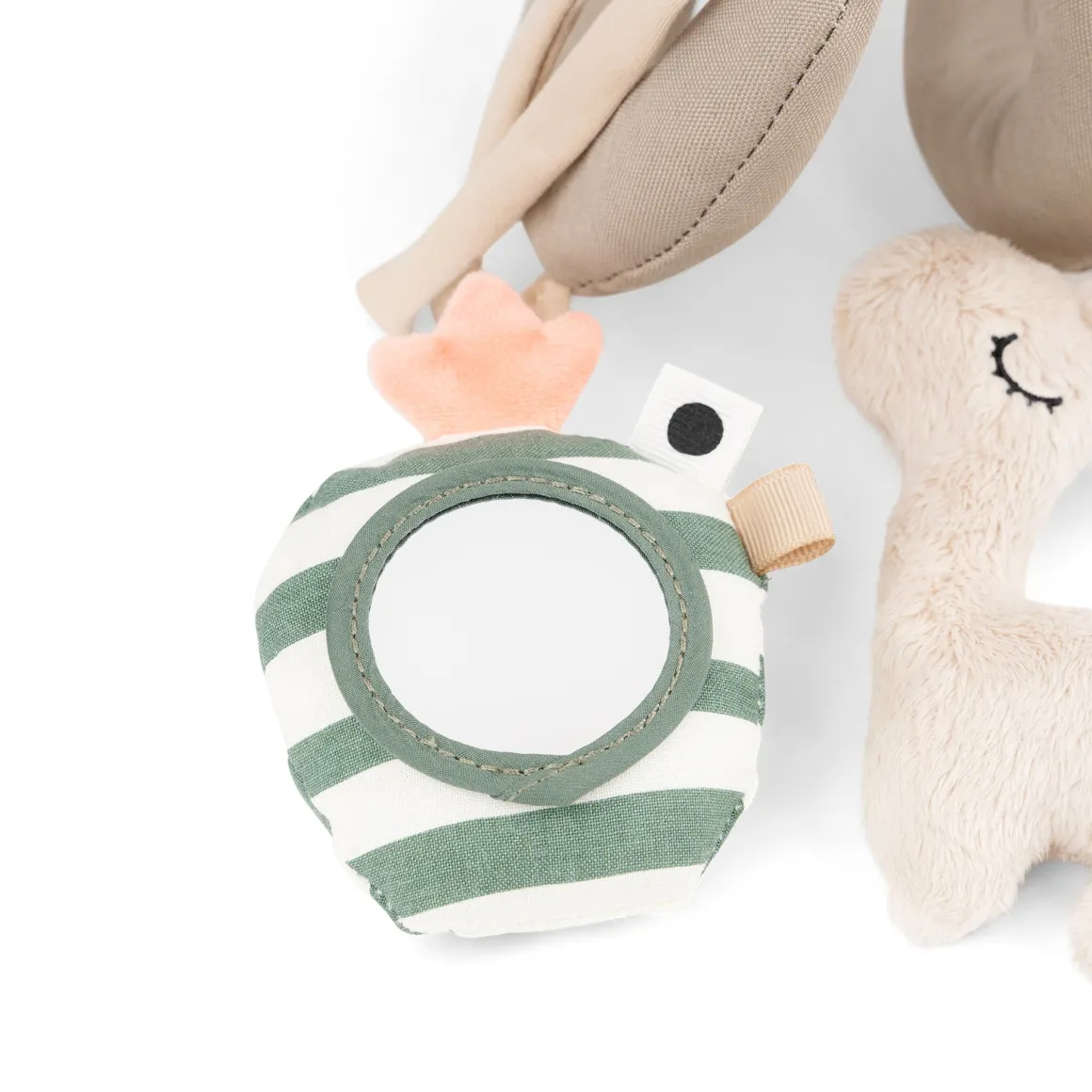Le jouet d’activité pour bébé est dans des tons doux de sable avec des détails verts et bleus et des éclaboussures de rouge corail.